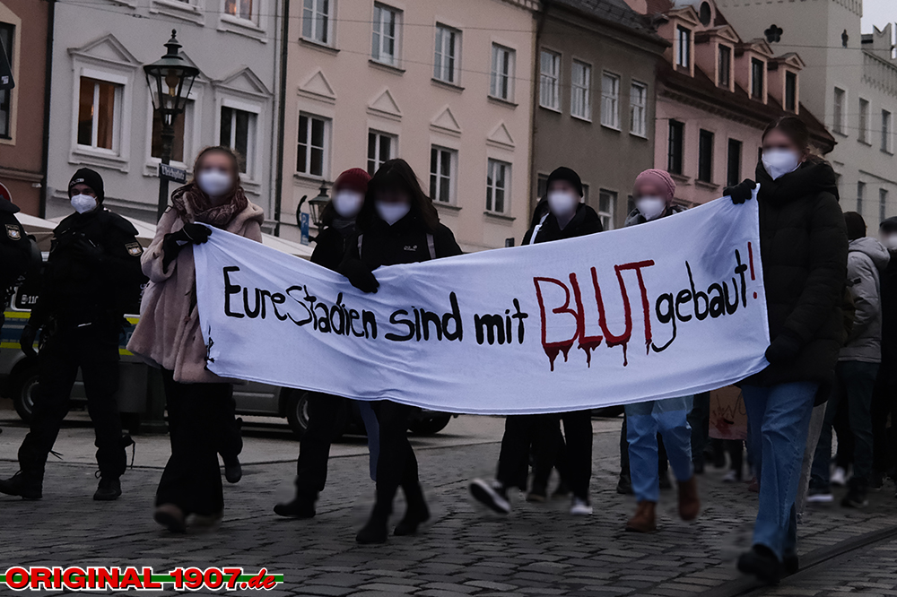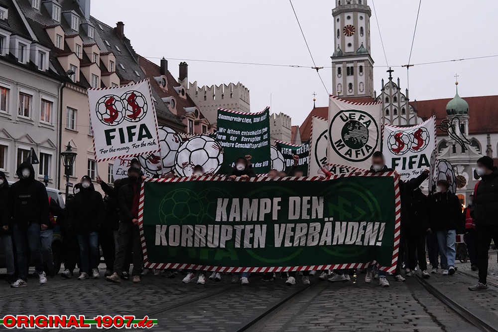 Die Fanszene des FC Augsburg organisierte bereits eine Demonstration zum Thema Weltmeisterschaft in Katar und zuletzt auch eine prominent besetzte „Blutige Spiele – Korrupte Verbände: Wie umgehen mit der WM in Katar?“-Podiumsdiskussion zum Thema. (Faszination Fankurve, 16.07.2022)