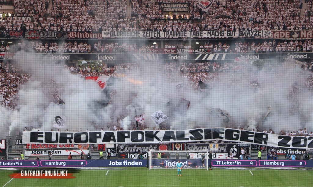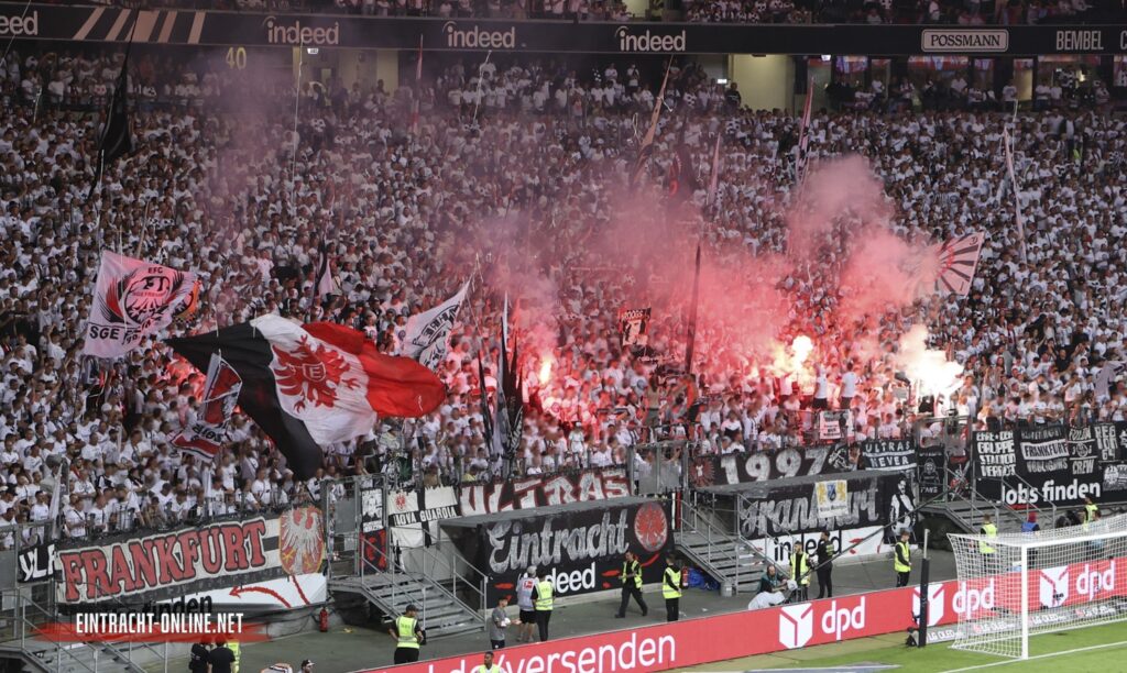 In der Nordwestkurve Frankfurt wurde die Partie mit einer „Europapokalsieger“-Aktion eingeleitet, bei der zuerst an den Erfolg im Jahr 1980 und dann an den Sieg 2022 erinnert wurde. Dazu stieg weißer Rauch empor.