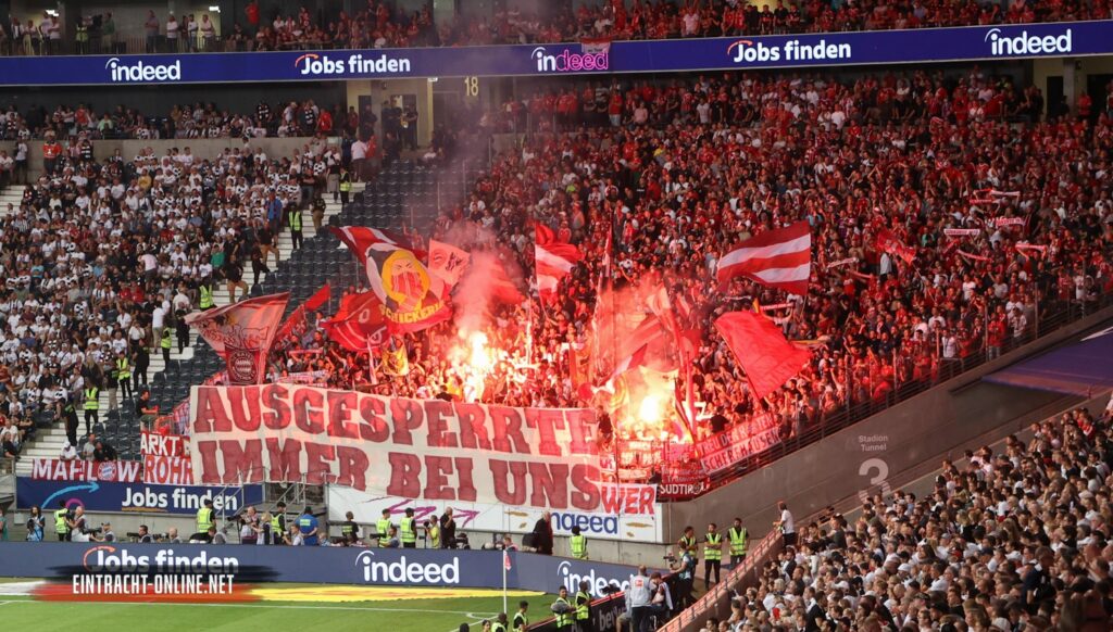 Im Gästeblock wurden hinter einer „Ausgesperrte immer bei uns“-Botschaft Bengalische Fackeln gezündet. In der Nordwestkurve brannten ebenfalls noch Bengalos. Der Deutsche Meister gewann das Auswärtsspiel beim amtierenden Europa League-Sieger am Freitagabend deutlich mit 6:1. Das Waldstadion war mit 51.500 Fans restlos ausverkauft. Fast alle Eintracht-Fans folgten dabei dem Aufruf der Ultras Frankfurt und erschienen in weißen Shirt oder Trikots im Waldstadion und gaben so ein einheitliches Bild ab. (Faszination Fankurve, 06.08.2022)