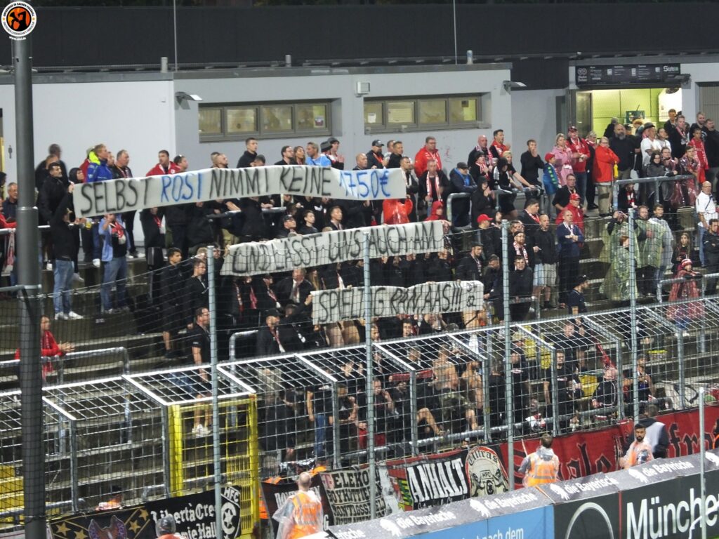Die mitgereisten Hallescher FC-Fans kritisierten im Vorfeld des Auswärtsspiels beim TSV 1860 München sowohl die dortigen Ticketpreise, als auch die geschlossene Tageskasse. Im Gästeblock des Grünwalder Stadions zeigten die HFC-Fans dazu in Anspielung an den bekannten „Skandal im Sperrbezirk“-Song der Spider Murphy Gang ein „Selbst Rosi nimmt keine 17,50 Euro und lässt uns auch am Spieltag ran aas!!!“-Spruchband. Außerdem wurde im Gästeblock noch ein beleidigendes „17,50 € für nen Steher? Kommt klar, ihr F….!”-Plakat zum Thema hochgehalten. Zudem zündeten die HFC-Fans noch schwarzen Rauch. (Faszination Fankurve, 20.08.2022)
