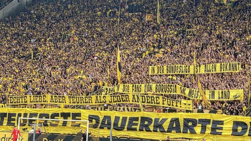 „Hier steht die teuerste Dauerkarte der Bundesliga“, stand deshalb gestern vor Beginn der 2. Halbzeit in Großbuchstaben vor der Südtribüne Dortmund geschrieben. Die Ultras von The Unity ergänzten dazu ein „In der Bundesliga ist allen bekannt – zahl’n die Fans von Borussia am meisten im Land“-Spruchband. Die Desperados Dortmund hielten gleichzeitig ein Plakat hoch, auf dem „Echte Liebe, aber teurer als jeder andere Puff!“ zu lesen war.