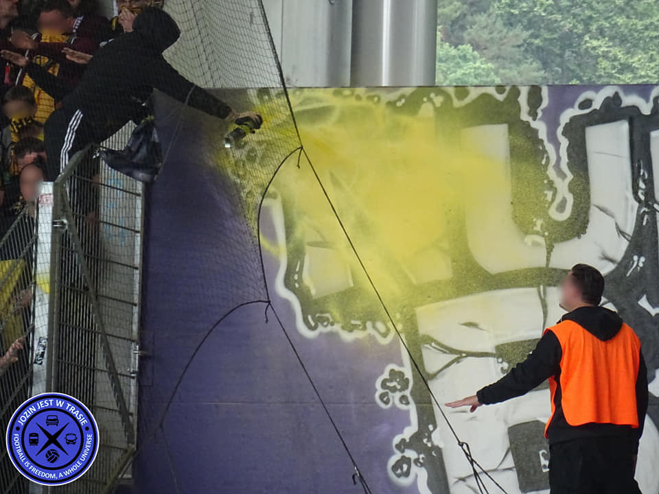 Beim gestrigen Nachbarschaftsduell zwischen dem FC Erzgebirge Aue und Dynamo Dresden gelang es einem vermummten Dynamo-Fan ein „Nur die BSG“-Wandbild teilweise mit gelber Farbe zu übersprühen. Mit einer Spraydose in der Hand klettere der Dynamo-Fans auf den Zaun.