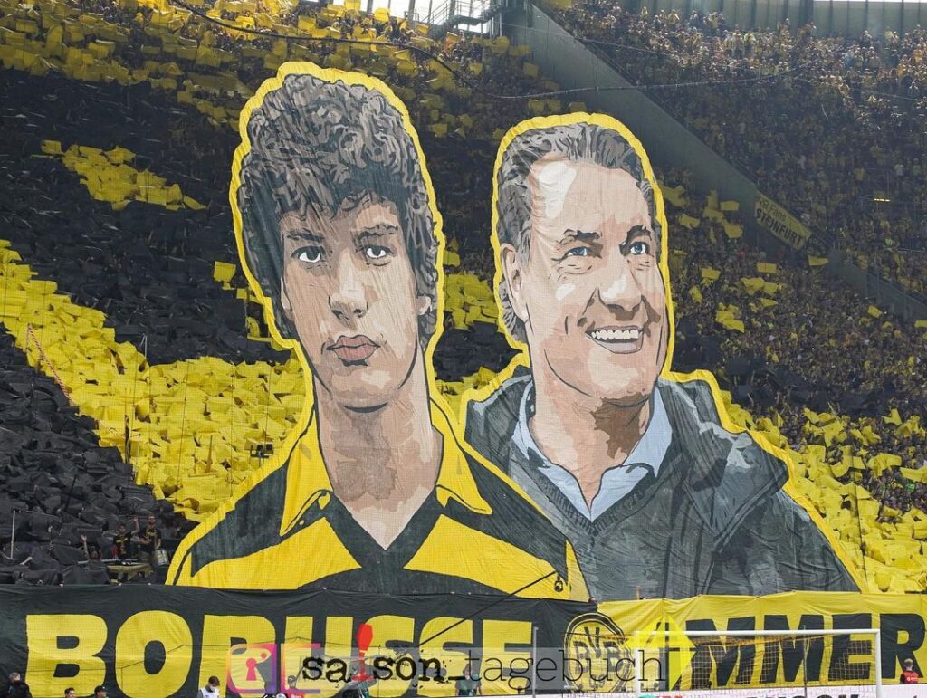 Die Verabschiedung von Michael Zorc mit einer großen „EINMAL BORUSSE – IMMER BORUSSE“-Choreografie auf der Südtribüne Dortmund kommt in dem Video ebenfalls vor. (Faszination Fankurve, 05.09.2022)
