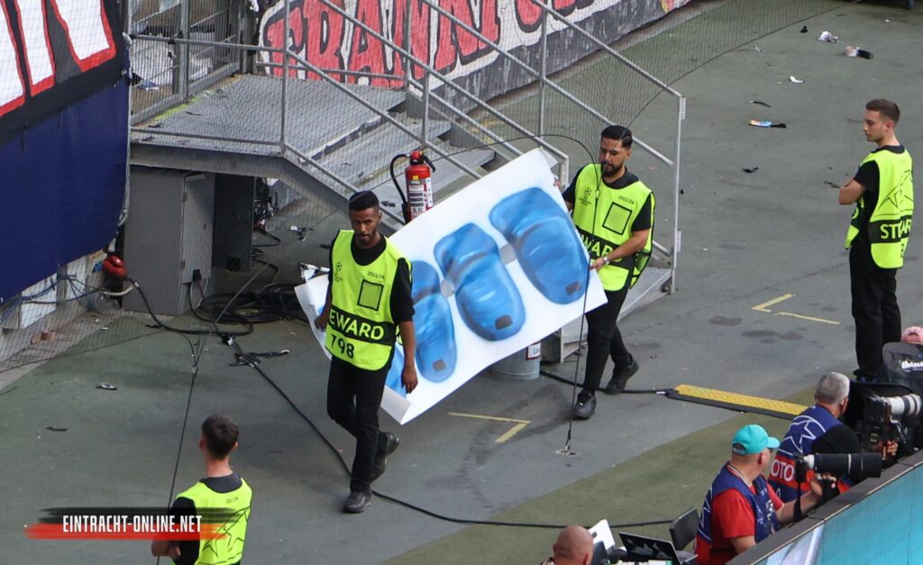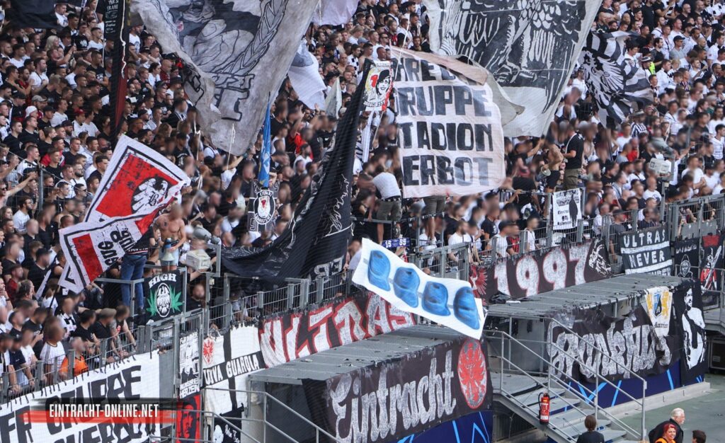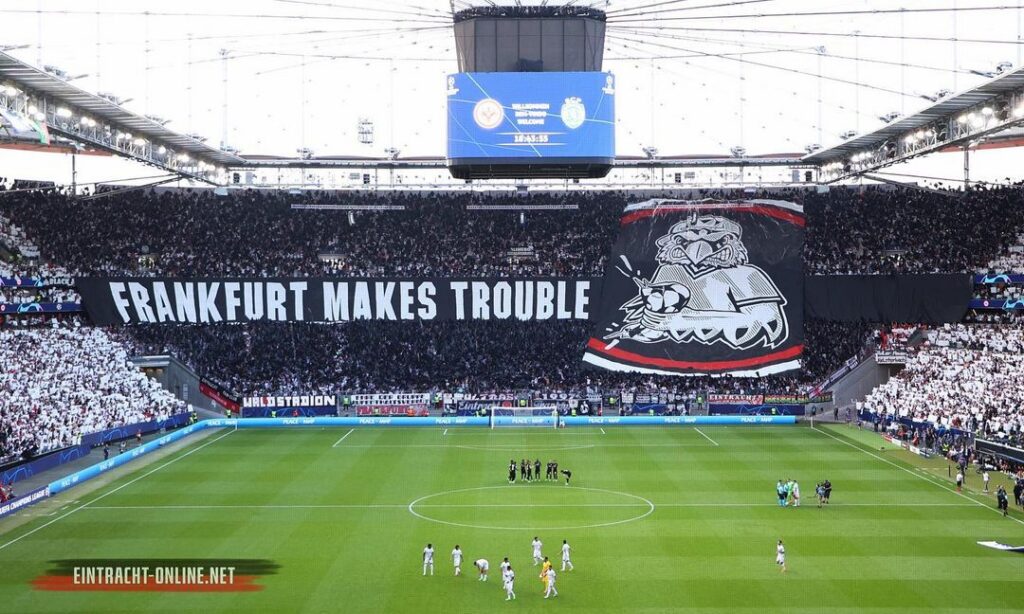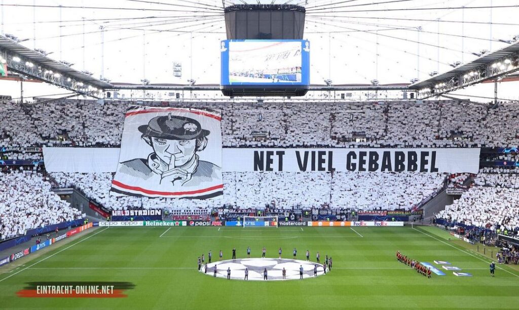 Eintracht Frankfurt spielt in der Champions League. Zum Auftakt gegen den Sporting Clube de Portugal bedeckten die Ultras Frankfurt das komplette Waldstadion mit einer Choreografie. Lediglich der Gästeblock im Unterrang wurde ausgespart. „Net viel Gebabbel“, lautete der erste Teil des Mottos zur Choreografie.
