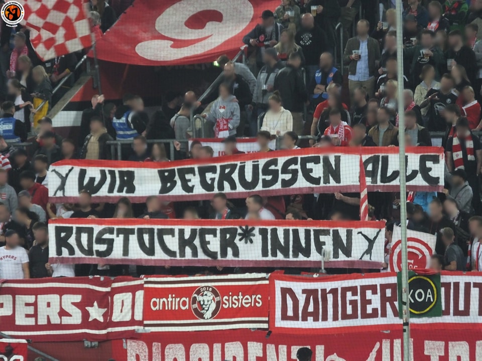 Dissidenti Ultra zeigte gestern außerdem ein „Wir begrüßen alle Rostocker*innen“-Spruchband. Die Gruppe reagierte damit auf die „Der Verein ohne Titel, das wird sich nie ändern! Statt Stern auf dem Trikot nur Meisterinnen im Gendern! Scheiß St. Pauli!“ und „Euer Gender-Scheiß interessiert in Wolgast keine Sau! Hier gibt es nur Jungs, Mädchen, Mann und Frau! Scheiß St. Pauli“-Plakate der FC Hansa-Fans beim Heimspiel gegen den FC St. Pauli. Fortuna Düsseldorf gewann am Samstagabend vor 26.719 Zuschauenden, darunter etwa 2.300 Gästefans, mit 3:1. (Faszination Fankurve, 11.09.2022)
