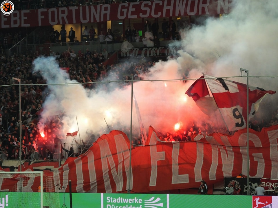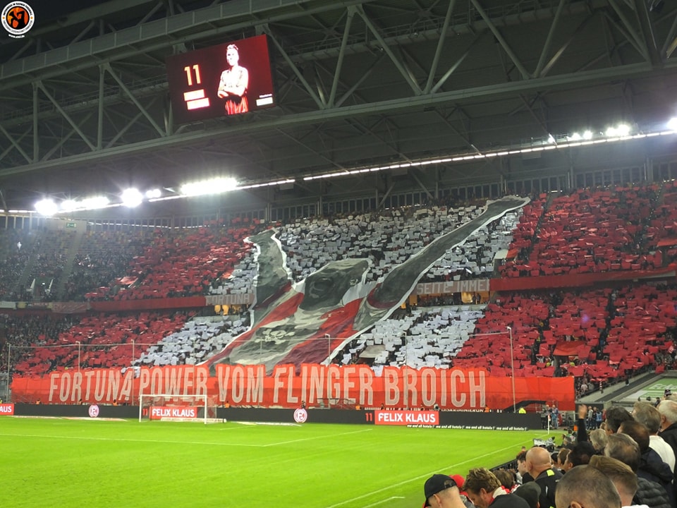 „Fortuna Power vom Flinger Broich“, lautet das Motto auf der gegenüberliegenden Seite, wo auf einer Blockfahne ein Fortuna-Spieler mit ausgestreckten Armen abgebildet war. Im Hintergrund hielten F95-Fans rote und weiße Zettel hoch. Zudem zündeten Fortuna-Ultras noch Pyrotechnik.