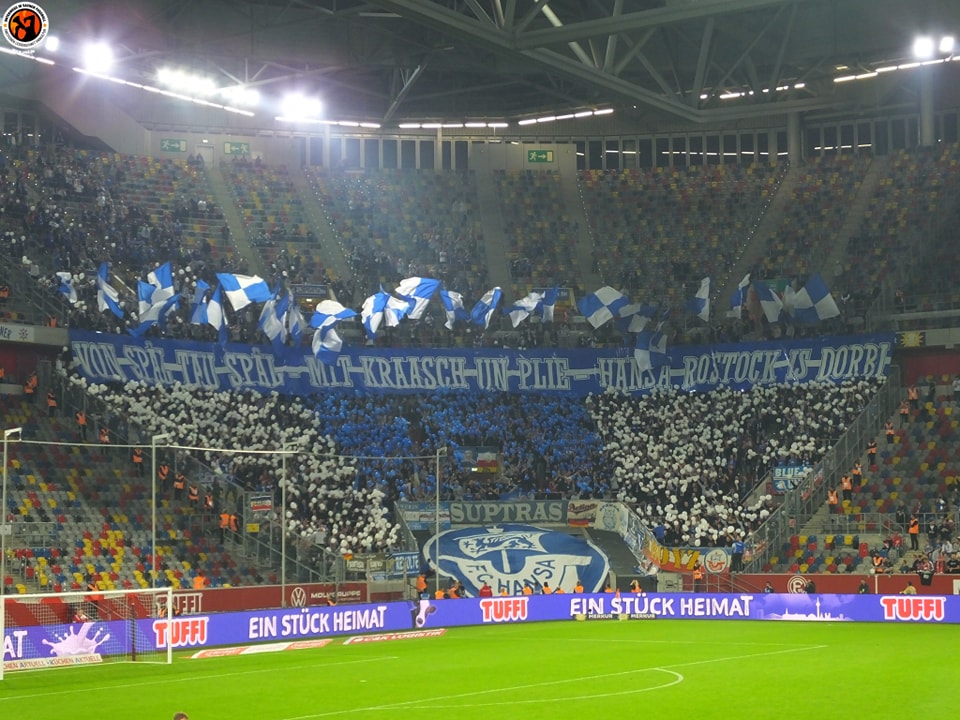 Das gestrige Zweitligaspiel zwischen Düsseldorf und Rostock wurde von beiden Fanlagern mit Choreografien eingeleitet. Ein Hansa Rostock-Wappen über dem Mundloch im Gästeblock, dazu blaue und weiße Luftballons sowie Schwenkfahnen ergaben das Bild im Gästeblock.