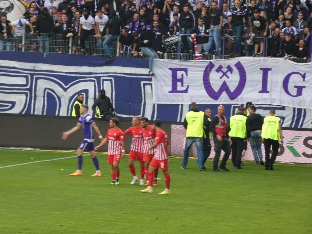 In der Halbzeitpause sprangen dann mehrere Aue-Fans in den Innenraum, wurden von den Ordnungskräften aufgehalten. Auf dem Rasen war es in der 14. Spielminute Johan Gomez, der den einzigen Derbytreffer des Nachmittags erzielte, der letztlich auch zählte.