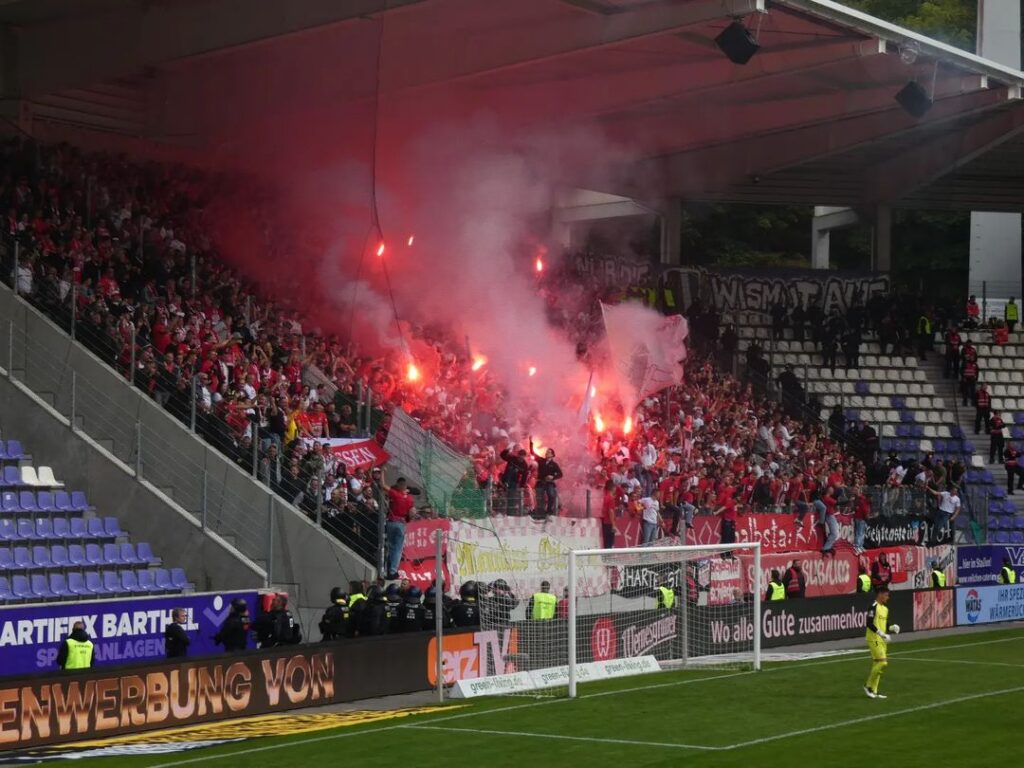 Aue-Fans werfen in der Schlussphase Pyrotechnik auf den Rasen: