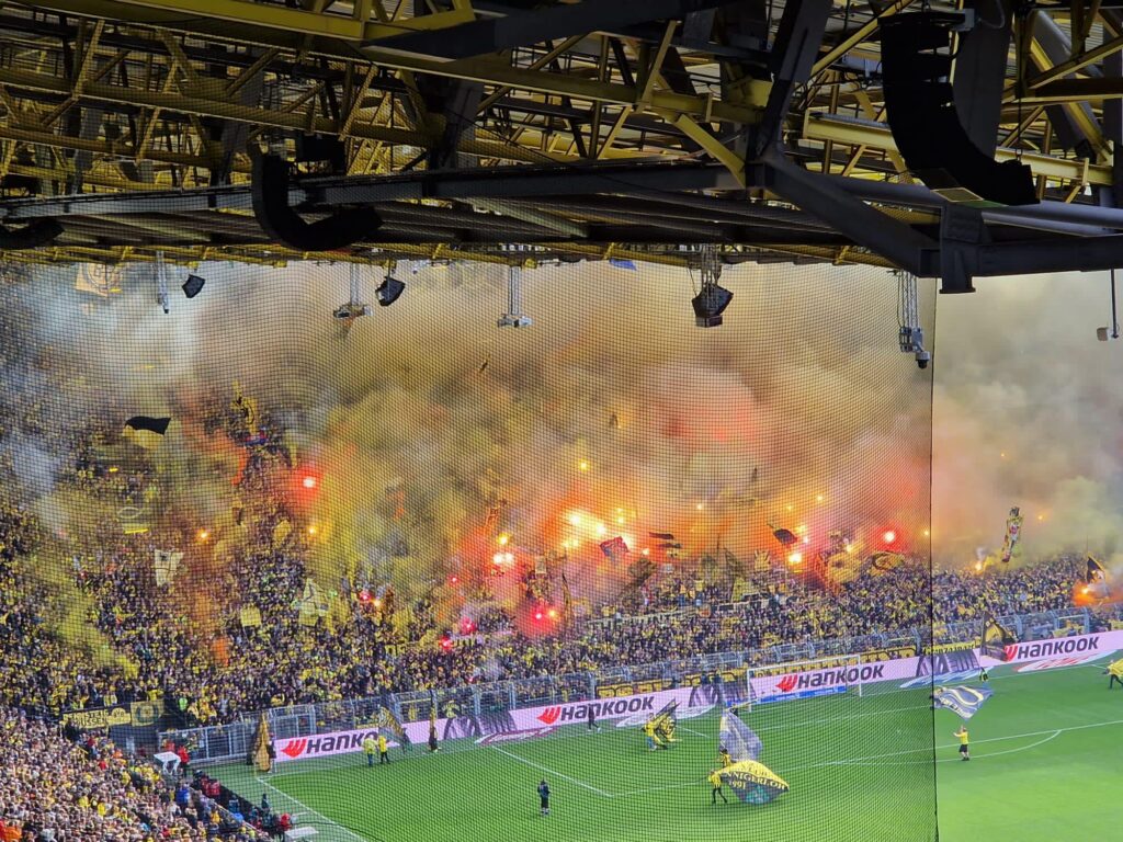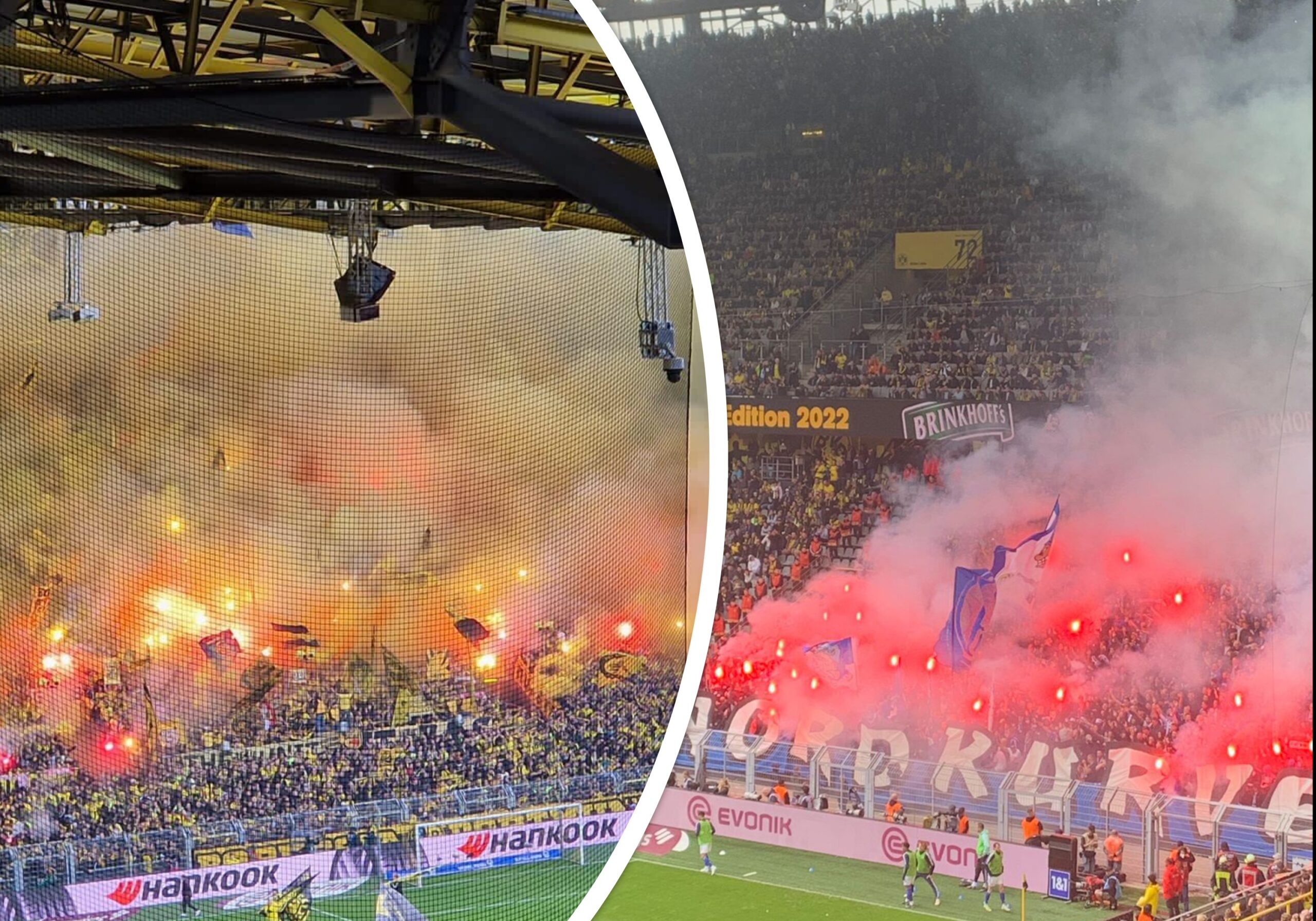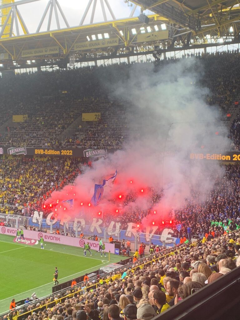 Die Südtribüne Dortmund verwandelte sich vor Anpfiff des heutigen Revierderbies in ein Meer aus Bengalischen Fackeln und Rauch. Im gegenüberliegenden Gästeblock gab es zu Beginn des Spiels erstmal keinen organisierten Support und auch kein Intro. Der Grund hierfür war, dass hunderte Schalke-Fans noch auf Einlass ins Westfalenstadion warteten, darunter auch die Schalker Ultras. Die aktive Fanszene des FC Schalke 04 reiste ab dem Dortmunder Schulzentrum Hacheney zu Fuß zum Westfalenstadion an. Am Wirtschaftsweg an den Westfalenhallen hinderte die Polizei die Schalker Fanszene am Weitergehen, weil auch am Eingang zum Gästeblock bereits ein Stau entstand. Damit zog die Polizei den Unmut der anreisenden Gästefans auf sich, die somit den Anpfiff des Spiels verpassten. Nach einer guten Viertelstunde betraten die Ultras der Gastmannschaft dann geschlossen den Gästeblock, machten sich dort in den ersten Reihen breit.