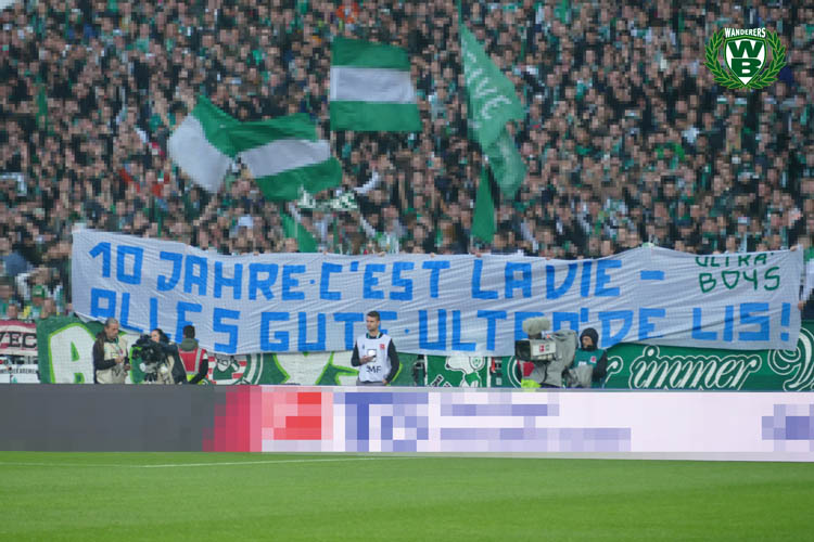 Mehrere Gruppen zeigten Spruchbänder zu 15 Jahren Wanderers. Die Ultra’ Boys Bremen gratulierten außerdem noch ihren Freunden aus Darmstadt zudem zu 10 Jahren Ultra’ de Lis. Zum Intro wurden in der Ostkurve Fahnen geschwenkt und einer Blockfahne mit dem Vereinswappen von Werder Bremen ausgebreitet.