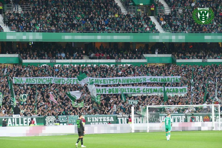 Die Wanderers Bremen thematisierten mit Spruchbändern, auf denen „DNA-Abstriche und Öffentlichkeitsfahndung!? Solidarität mit den Ultras Chemie. ACAB“ und „Ittrich unterbricht das Spiel, Beleidigungen gegen die Familie sind einfach zu viel! Bullenschweine!“ zu lesen war, noch die jüngsten Repressionen gegen BSG Chemie Leipzig-Fans und die umstrittene Spielunterbrechung beim Spiel Borussia Mönchengladbach gegen RB Leipzig.