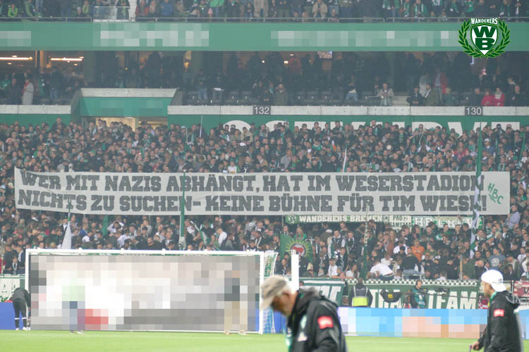 Die HB Crew kritisierte zudem mit einem „Wer mit Nazis abhängt, hat im Weserstadion nichts zu suchen – Keine Bühne für Tim Wiese!“-Spruchband die Teilnahme von Tim Wiese am Abschiedsspiel für Claudio Pizarro in der Vorwoche im Bremer Weserstadion. Dem ehemaligen Werder-Torwart wird laut Deichstube Nähe zum Motorradclub „Radikal Kameradschaft Bremen“ vorgeworfen, von wo aus es wiederum Kontakte zum umstrittenen Sänger der Band Kategorie C geben würde. Wiese räumte gegenüber Deichstube eine Freundschaft zum Gründer des Motorradclubs ein, beteuerte jedoch, nichts mit der rechten Szene zu tun zu haben.