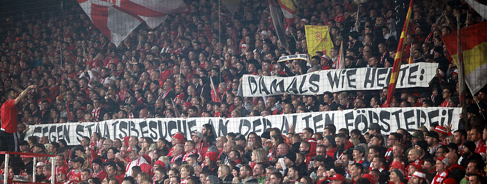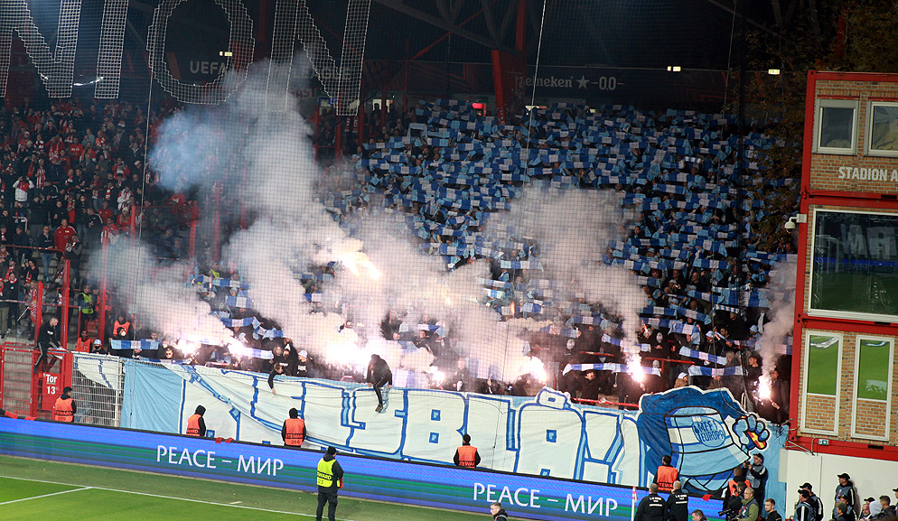 Zum Einlaufen der Mannschaften war auf der Waldseite am Donnerstag eine gelungene Choreografie zu bestaunen. Am Netz wurde ein Flugzeug mit „Eisern Union“-Schriftzug hochgezogen, das vor einer Gebirgskette im Sonnenuntergang startet. „Schnallt euch alle an – Union spielt in Europa!“ war dazu vor der Waldseite zu lesen.