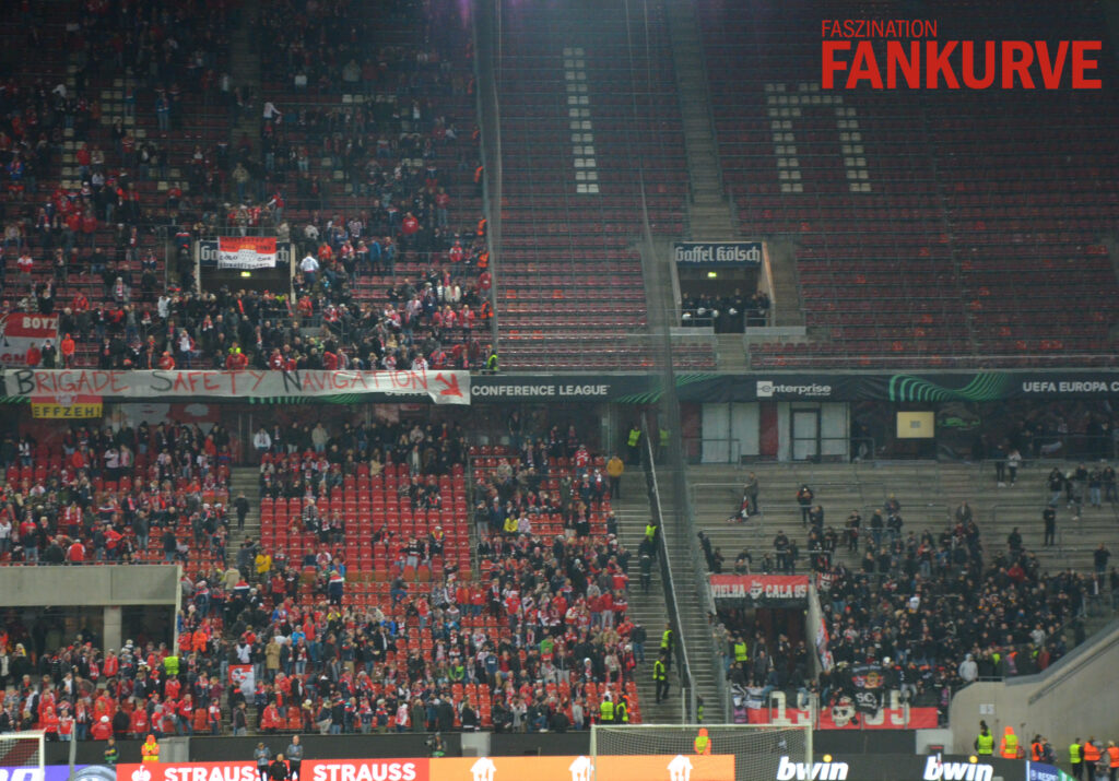 Seitlich über dem Gästeblock brachten Kölner Fans ein „Brigade Safety Navigation“-Spruchband an, wobei die Anfangsbuchstaben BSN für Brigade Sud Nice dabei farblich hervorgehoben wurden. Ein Pfeil in Form eines Flugzeugs zeigte dabei in Richtung der Gästefans im Unterrang. Die Kölner spielten damit auf die Anreise der OGC-Ultras unter ständiger Begleitung der Polizei an. Der Sonderflug der Ultras machte sich bereits nach dem Spiel auf den Rückweg in Richtung Südfrankreich.
