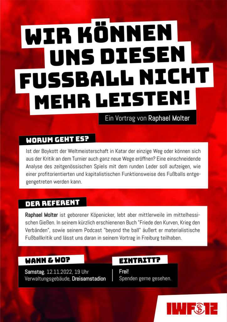 Die aktive SC Freiburg-Fangruppe IWF 12 organisiert am kommenden Samstag im Dreisamstadion einen Vortrag mit dem Autor Raphael Molter. Unter dem Titel „Wir können uns diesen Fußball nicht mehr leisten“ soll es um die Profitorientierung im modernen Fußball gehen.