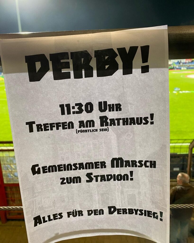 „Pünktlich sein“, lautete ein Hinweis auf dem Derby-Flyer der SVM-Fans. Letztlich war es jedoch die Fanszene des VfL Osnabrück, die am vergangenen Samstag ab 09:00 Uhr für die Polizei völlig überraschend in Meppen auftauchte und als erste Fanszene am Rathaus erschien. Etwa 200 Osnabrück-Fans reisten laut Polizeiangaben mit Bussen nach Meppen an und begaben sich zum Rathaus, weshalb schnell weitere Polizeikräfte hinzugerufen wurden. Eine Gruppe von SV Meppen-Fans habe später versucht auf den Markt zu gelangen, doch die Polizei will dabei ein direktes Aufeinandertreffen beider Fanlager verhindert haben.
