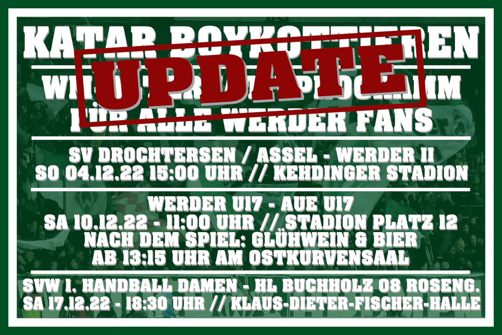 „Moin Werderfans, leider gibt es eine kurzfristige Änderung unseres WM-Alternativprogramms. Das Spiel der U19 in Wolfsburg wurde abgesagt. Die Polizei in Wolfsburg will uns Werderfans in diesem Jahr wohl einfach nicht willkommen heißen“, teilten Wanderers Bremen, UltrA-Team Bremen, HB Crew und L’Intesa Verde dazu mit.