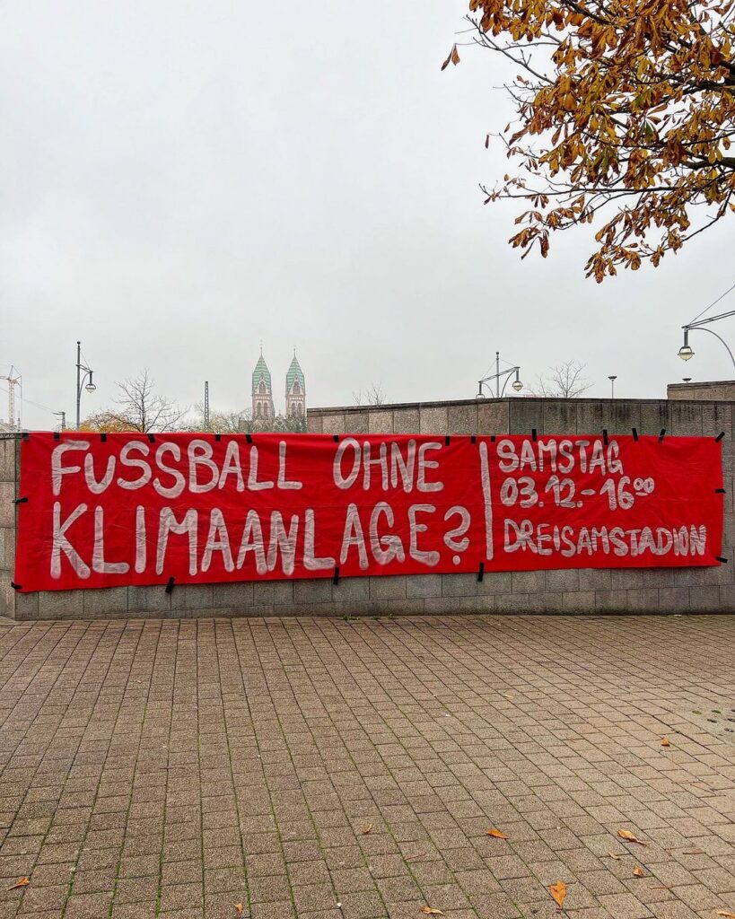 Mit einem „Fußball ohne Klimaanlage? Samstag 03.12. – 16:00 Uhr – Dreisamstadion“-Plakat machten SC Freiburg-Fans nochmal deutlich, dass der Besuch des Frauenteams des SC Freiburg einen Kontrast zur Weltmeisterschaft der Männer in Katar darstellt. In dem Wüstenstaat werden die Stadien mit Klimaanlagen heruntergekühlt, während in Freiburg morgen Temperaturen knapp über dem Gefrierpunkt erwartet werden. (Faszination Fankurve, 02.12.2022)