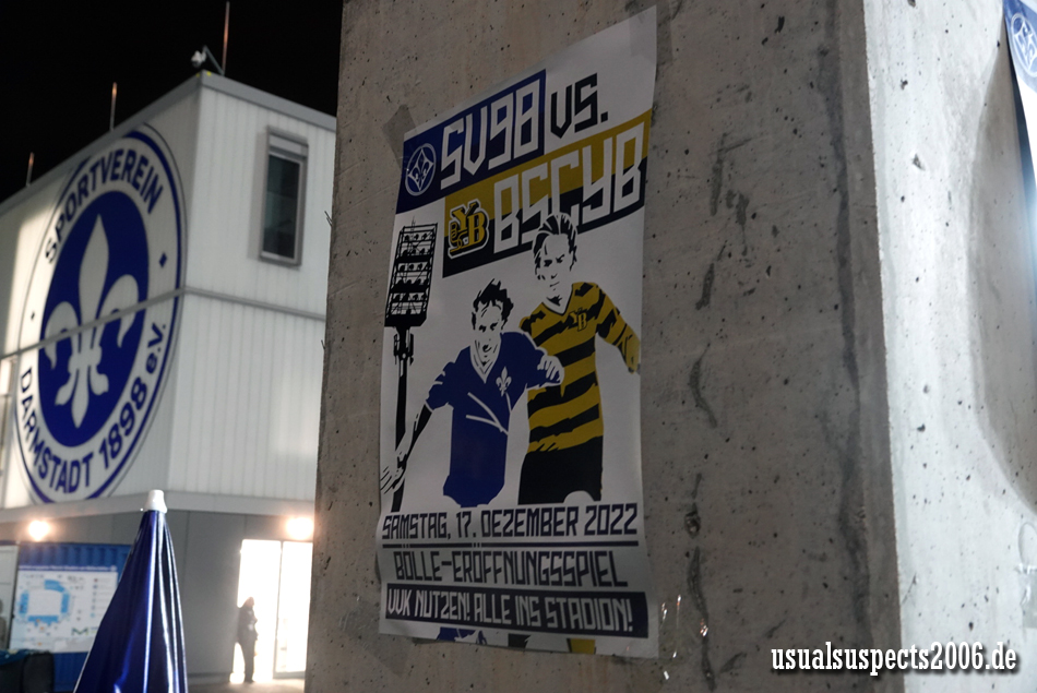 In der Fanszene des SV Darmstadt 98 wurde unter dem Motto „Alle ins Stadion“ bereits kräftig für das „Bölle Eröffnungsspiel“ mobil gemacht. Bei der Partie können nach dem Stadionumbau erstmals wieder alle vier Tribünen des Böllenfalltors genutzt werden. Im Anschluss an das Spiel folgt eine „Aftermachtparty“ beider Fanszenen mit Live-Musik in der Böllenfalltorhalle. Für Gäste aus der Schweiz richteten die Lilienfans zudem eine Schlafplatzbörse ein. (Faszination Fankurve, 06.12.2022)