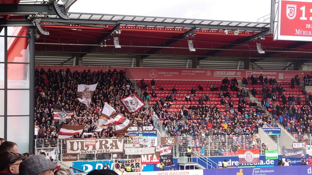Während des Auswärtsspiels des FC St. Pauli in Regensburg fertigte die Polizei anlasslos (Portrait-)Aufnahmen von St. Pauli Fans im Gästeblock an. Bereits in der ersten Halbzeit des Spiels am 18.09.2022 kritisierte die Braun-Weisse Hilfe diese unverhältnismäßige Praxis der Polizei im Regensburger Jahnstadion. Von der angrenzenden Tribüne fotografierten dafür speziell ausgerüstete Polizist:innen mithilfe mindestens eines sogenannten ‚Tele-Objektives‘ die anwesenden Gäste-Fans. Selbst aus Perspektive der Polizei sind uns keine Vorfälle bekannt, die dieses Vorgehen auch nur ansatzweise rechtfertigen könnten – die getätigten Aufnahmen müssen somit als anlasslos und schlicht willkürlich bezeichnet werden!