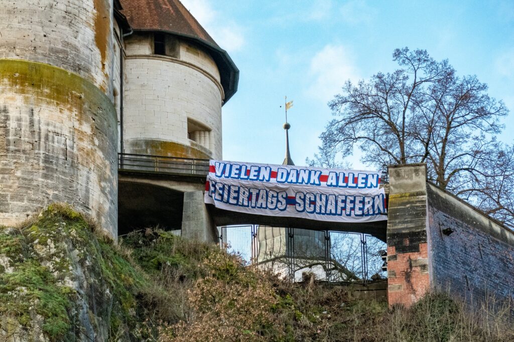 Auch in diesem Jahr bedankten sich Ultras des 1. FC Heidenheim zu Weihnachten wieder bei Menschen, die über die Feiertage arbeiten mussten und damit einen wichtigen Dienst für die Gesellschaft leisteten. Unitas Aquileiae brachte an Heiligabend für diese Menschen ein Dankesplakat am Schloss Hellenstein an.