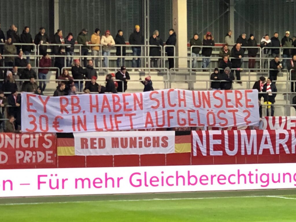Beim gestrigen Testspiel am FC Bayern-Campus war dann ein Spruchband von aktiven FC Bayern-Fans zu sehen, auf dem „Ey RB, haben sich unsere 30 € in Luft aufgelöst?“ geschrieben stand. Die Fans des deutschen Rekordmeisters erneuerten damit ihre Forderung nach Rückzahlung.
