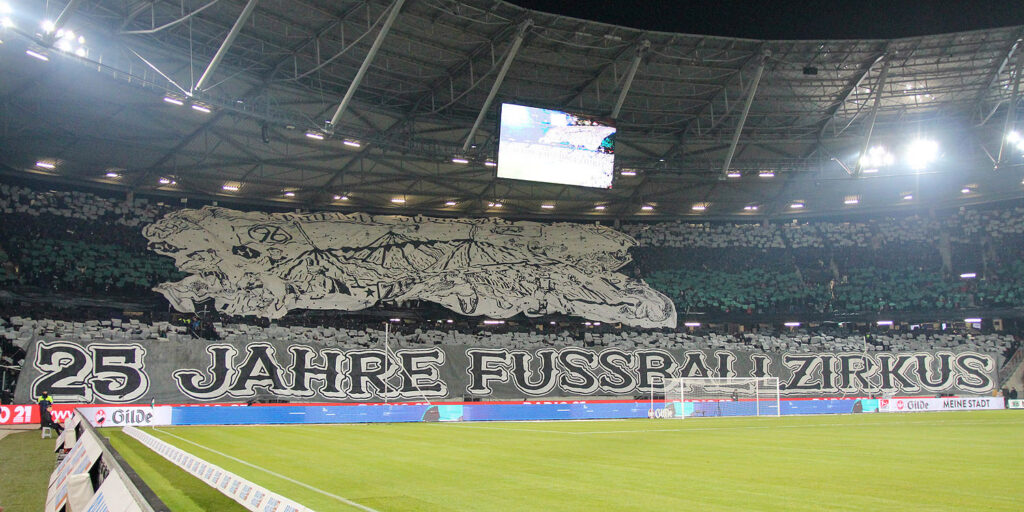 36.800 Fans kamen für das Samstagabendspiel der 2. Bundesliga ins Niedersachsenstadion und erlebten dabei ein Spektakel auf den Rängen. Die Hannover 96-Ultras von Komplott Hannovera feierten ihren 25. Geburtstag mit einer großen Choreografie in der Nordkurve.