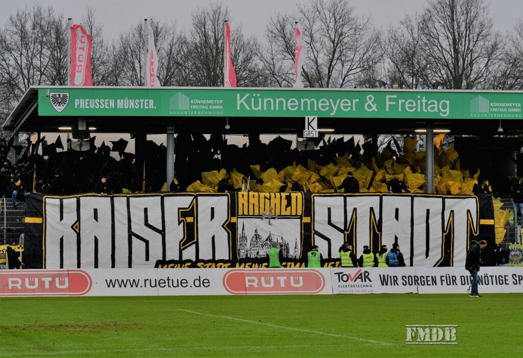 „Kaiserstadt Aachen – Meine Stadt, meine Heimat, mein Verein“, lautete das Motto der Choreografie im Gästeblock. Wegen des Stadionumbaus erhielt die Alemannia für das Spiel in Münster lediglich 680 Stehplatzkarten, die schnell vergriffen waren. Mit einem „Ihr seid das Aue des Westens!“-Spruchband stichelten Preußen-Fans in der Fiffi-Gerritzen-Kurve noch etwas gegen die Gäste aus dem tiefsten Westen deutschlands.