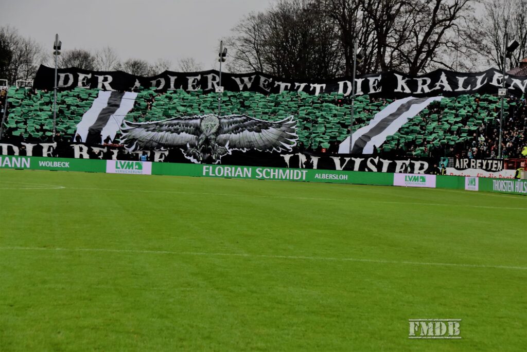 Dort präsentierten die Ultras vor Anpfiff der Partie in der Fiffi-Gerritzen-Kurve eine Choreografie, die unter dem Motto „Der Adler wetzt die Krallen – Die Beute im Visier“ stand. Vor der Kurve wurde dabei ein detailliert gemalter Adler hochgezogen, im Hintergrund waren grüne Zettel zu sehen.