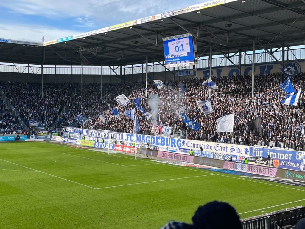 Auf dem Podest präsentierten FCM-Fans gestern eine „Barrio Norte“-Zaunfahne mit KSC-Wappen. Auf dem Rasen gingen die Gäste aus Karlsruhe vor 19.520 Fans im Heinz-Krügel-Stadion bereits in der dritten Minute durch Jung in Führung. Elfadli sorgte in der vierten Minute der Nachspielzeit noch für den späten Ausgleichstreffer für den FCM. Doch zufrieden waren viele Magdeburg-Fans mit diesem Ergebnis nicht.