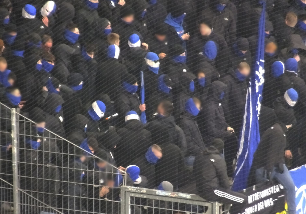 Die SGE-Fans packten, wie bei Pokalspielen üblich, wieder ihre Zaunfahnen mit schwarzem Kreuz auf weißem Hintergrund aus. Passend dazu wurden in der Kurve Doppelhalter im gleichen Design hochgehalten, auf denen Orte aus Hessen und dem Einzugsgebiet von Eintracht Frankfurt zu lesen waren. Im Oberrang der sich aktuell im Umbau befindlichen Nordwestkurve schwenkten die SGE-Fans dabei noch schwarze und weiße Fahnen.