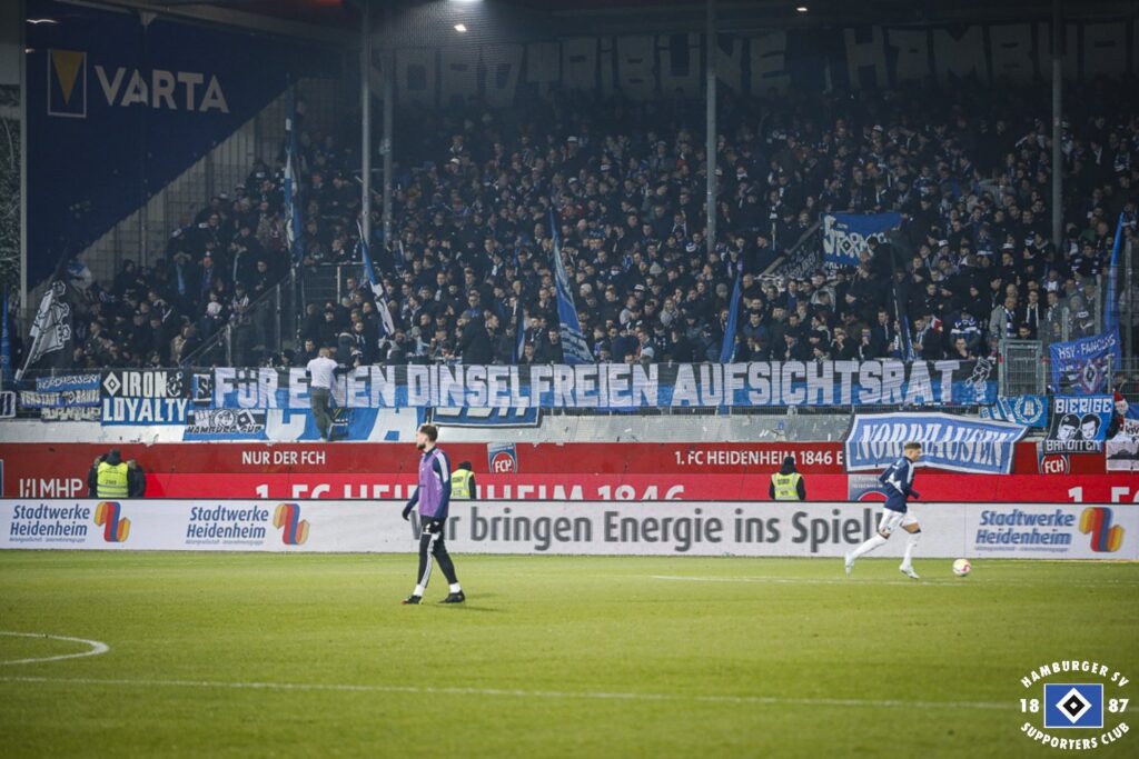Mit einem „Für einen dinselfreien Aufsichtsrat“-Plakat äußerten sich die Ultras der Castaways beim Auswärtsspiel des Hamburger SV beim 1. FC Heidenheim zu einem vereinspolitischen Thema zu Wort. In einem Statement erklärte die Gruppe, was die Intention hinter dem Plakat sei. (Faszination Fankurve, 13.02.2023)