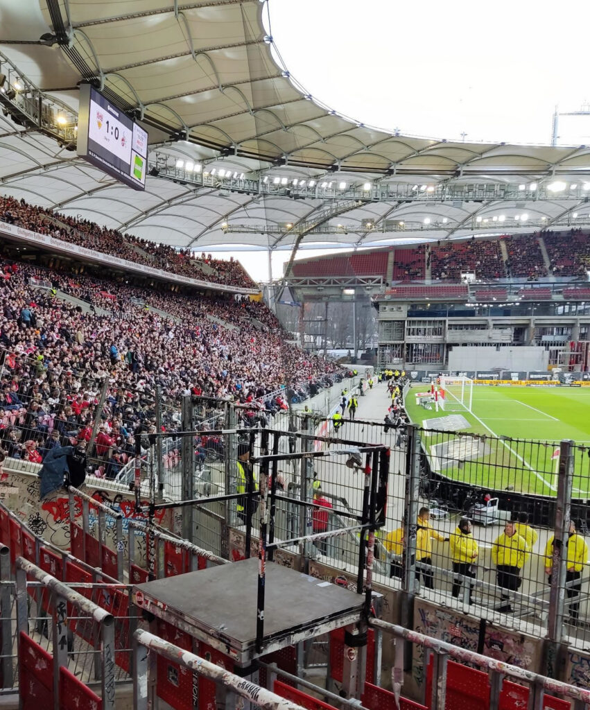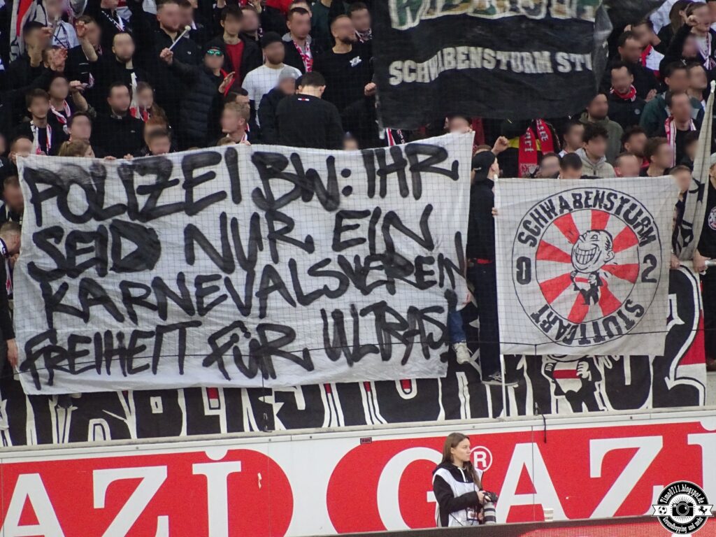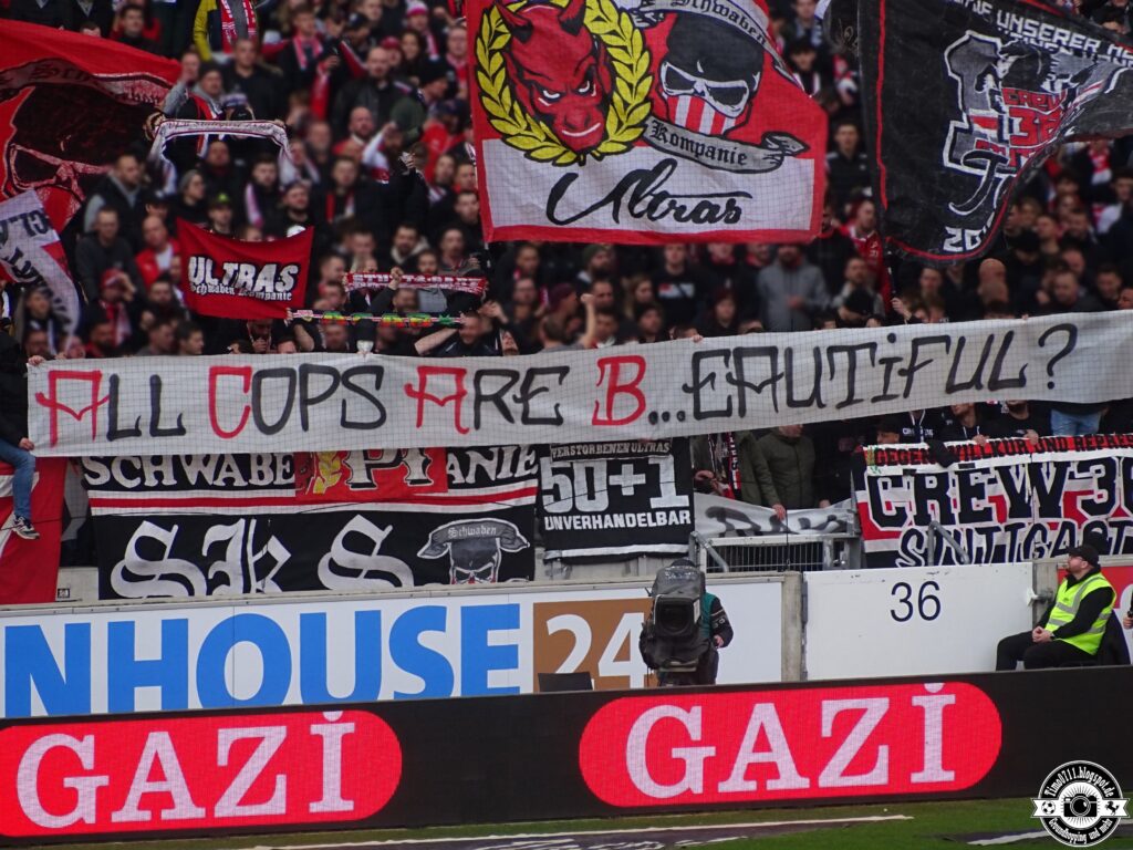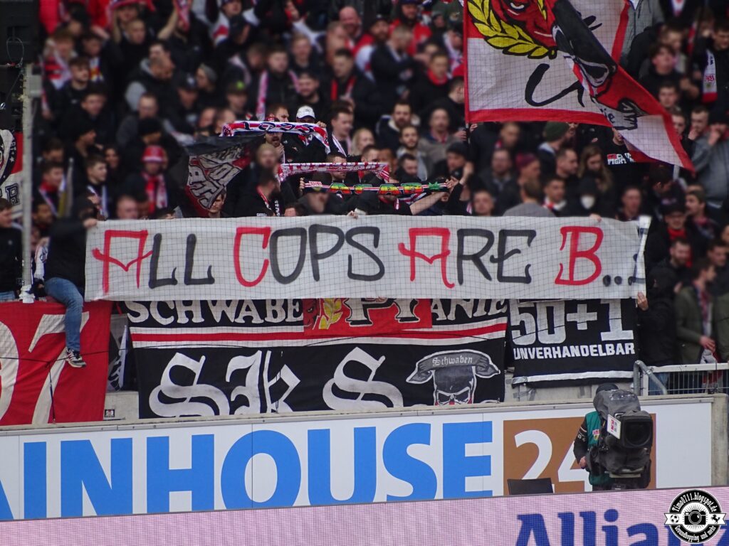 Ultras des VfB Stuttgart solidarisierten sich mit den von der Polizeikontrolle betroffenen Gästefans. Die Schwaben Kompanie Stuttgart zeigte in der Cannstatter Kurve zunächst ein „All Cops Are B…“-Plakat in der Cannstatter Kurve. Anschließend wechselte das Bild auf „All Cops Are Beautiful“. Anschließend fragte die Schwaben Kompanie in Richtung der Polizei, ob wegen des Spruchbands bereits eine Anzeige raus sei. Der Schwabensturm zeigte außerdem ein „Polizei BW: Ihr seid nur ein Karnevalsverein – Freiheit für Ultras!“-Plakat zum Thema. (Faszination Fankurve, 18.02.2023)