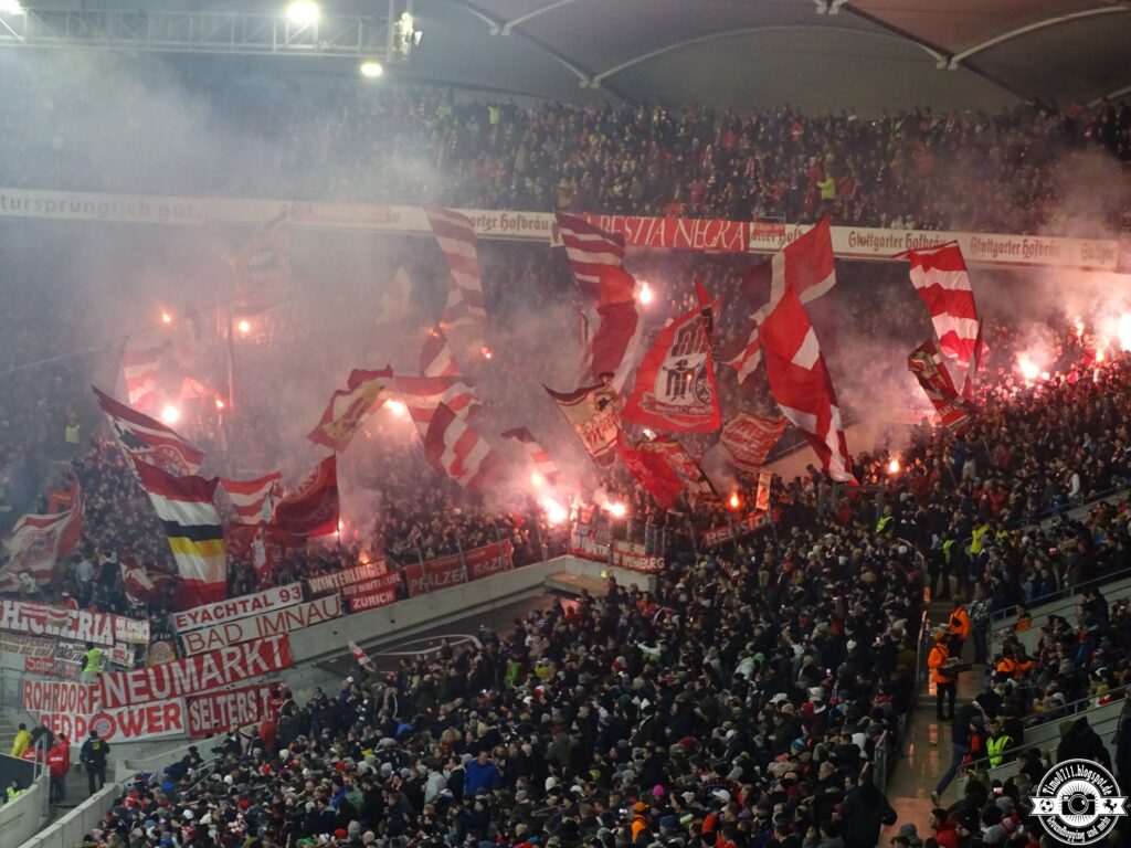 Beide Fanszenen zeigten vor Anpfiff der 1. und 2. Halbzeit große Pyroshows. So wurde vorm Anpfiff sowohl in der Cannstatter Kurve, als auch im Gästeblock Schwenkfahnen ausgebreitet, unter denen sich Ultras vermummen konnten.