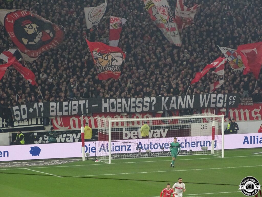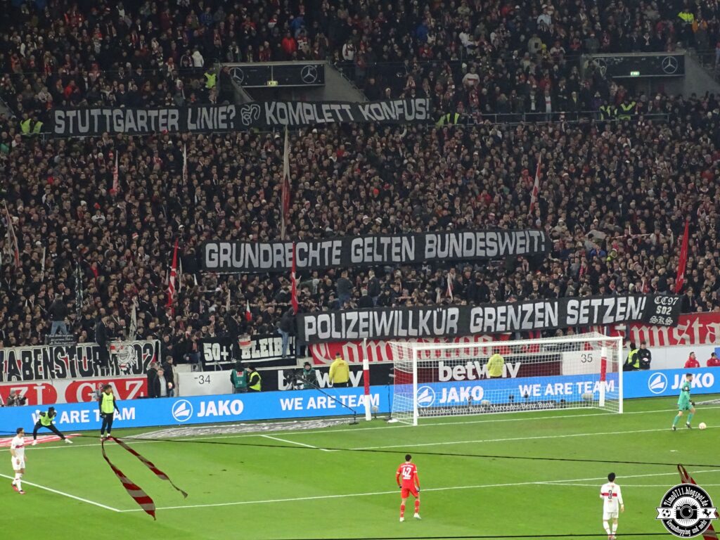 Das Commando Cannstatt zeigte zudem noch ein „50+1? Bleibt! – Hoeneß? Kann weg!“-Plakat und reagierte damit auf die jüngsten Verlautbarungen von Uli Hoeneß. „Meine Gedanken gehören mir! Chatkontrolle stoppen!“, stand noch auf einem Spruchband des Schwabensturms geschrieben.