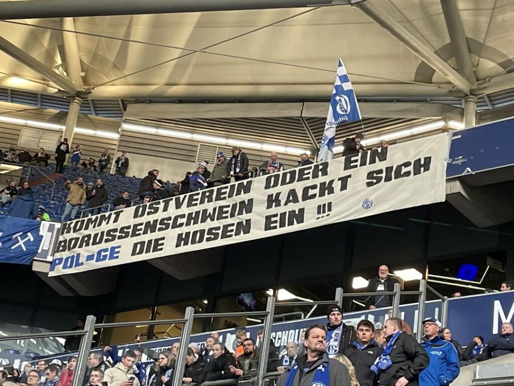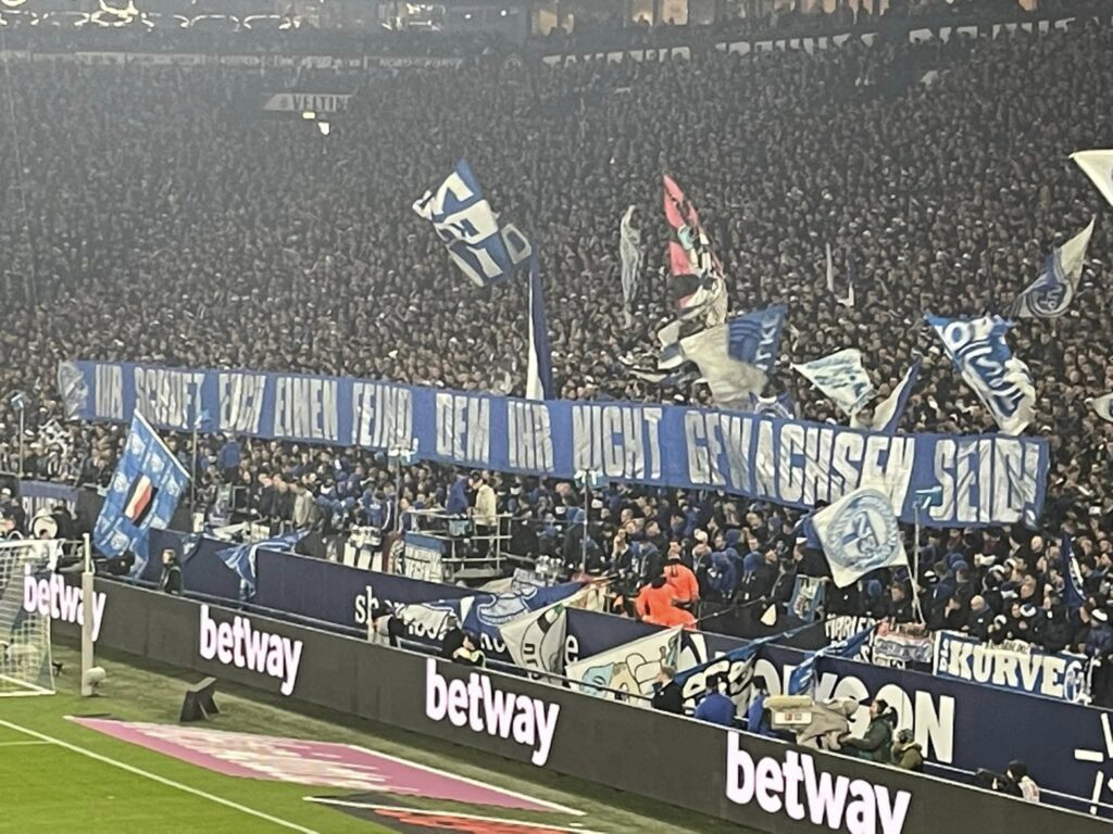 Im Verlauf der ersten Halbzeit waren sowohl im Bereich der Ultras Gelsenkirchen, als auch im I-Block Antworten auf ein Spruchband der BVB-Ultras auf der Südtribüne im Jahr 2015 zu lesen. „Euer Stich in unsere Herzen war groß – doch ihr habt unsere Augen geöffnet – und schuft euch einen Feind – dem ihr nicht gewachsen seid“, stand vor acht Jahren auf einem dreiteiligen Plakat auf der Südtribüne geschrieben. Die Botschaft entstand in einer Zeit, in der BVB-Ultras sich bei Kämpfen gegen Schalker Ultras überlegen fühlten. Zuvor hatten Schalker Ultras die Südtribüne Dortmund-Fahne erbeutet. Ein Stich ins Hert der BVB-Fans.