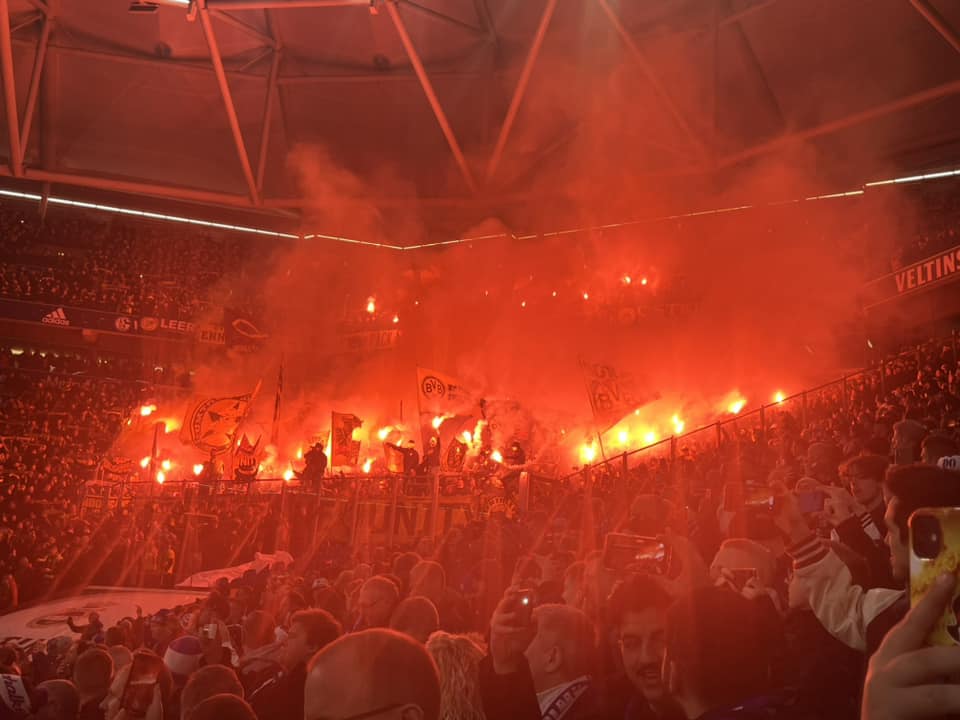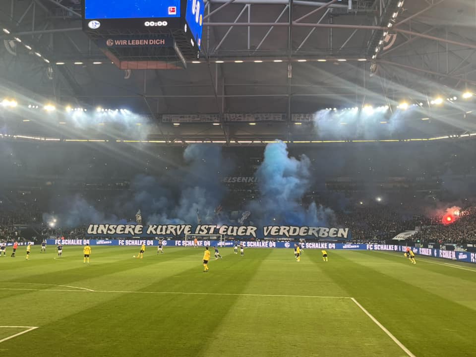 „Unsere Kurve ist euer Verderben“, lautete beim Intro das Motto in der Nordkurve Gelsenkirchen. Dazu zündeten Schalker Ultras Rauch und Pyrotechnik. Im Gästeblock zündeten BVB-Fans zahlreiche rote Fackeln und gelben Rauch.