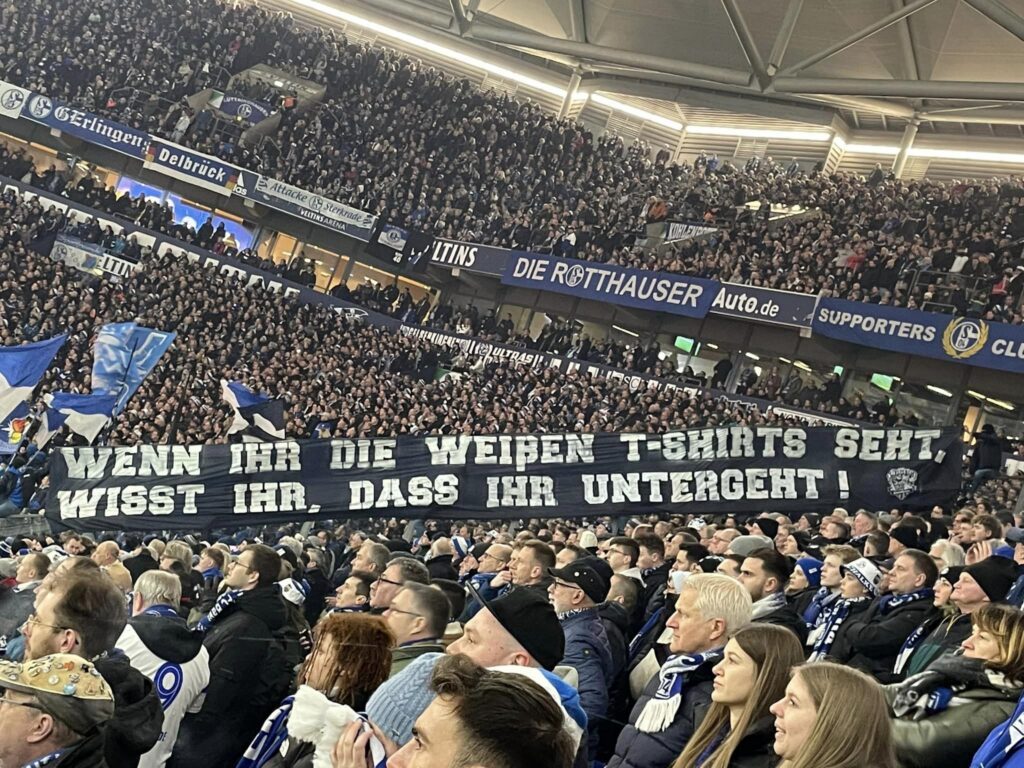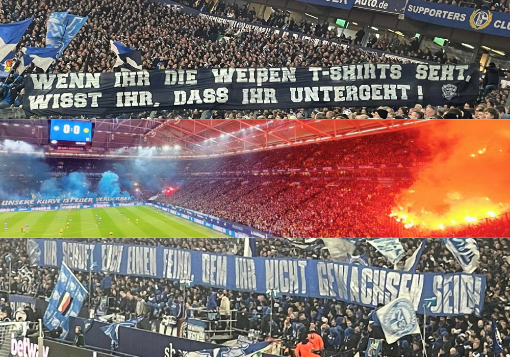 Nach einer Aktion gegen die später aufgelösten Jubos oder auch beim abgewehrten Angriff am Club 75 der Ultras Gelsenkirchen am 19. Februar 2023 sehen sich die Schalker Ultras aktuell wieder als „Die Nummer 1 im Pott“ auf der Straße. „Schalker sein heißt Probleme machen!“ und „Wenn ihr die weißen T-Shirts seht, wisst ihr, dass ihr untergeht!“, war dazu heute im I-Block zu lesen. „Schalker sein heißt Probleme kriegen? Ihr schuft euch einen Feind, dem ihr nicht gewachsen seid!“, lauteten die Antwort der Ultras Gelsenkirchen auf das Plakat der BVB-Ultras aus dem Jahr 2015.