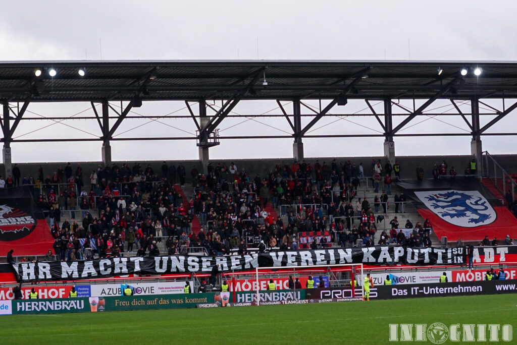 Nun ist aber der Zeitpunkt gekommen, an dem es uns immer schwerer fällt, die Mannschaft und die Verantwortlichen weiterhin im Stadion zu supporten. Das erklärte Ziel im Zweijahresplan war der Kampf um den Aufstieg in die zweite Liga. Dieses Ziel werden wir in diesem Jahr gnadenlos verfehlen. Unsere Kritik bezieht sich übrigens nicht – wie von unserem Cheftrainer provokativ vorgeworfen – auf die reinen Ergebnisse. Wir sind durchaus in der Lage, die Leistung der Mannschaft auch ergebnisunabhängig zu beurteilen. Das Fazit bleibt nur einfach das gleiche: Das ist nicht der Fußball, den wir in Ingolstadt sehen wollen! Mit diesem Kader und dieser Infrastruktur ist mehr zu erwarten!