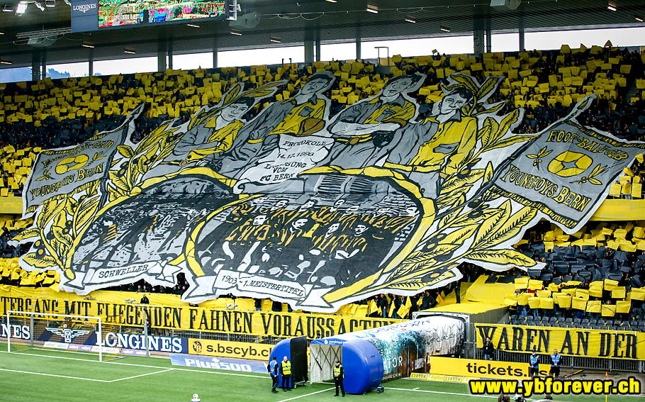 Mit einem „Die alten Propheten“-Wortlaut aus der Choreografie der BSC-Fans sowie dem Teil einer Blockfahne tauchten noch beim Warmmachen der Mannschaften Hinweise auf die Berner Jubiläums-Choreografie im Block der FC Basel-Fans auf. Dann ging im Gästeblock ein „Gespannt auf uff d YB-Jubiläumschoreo? wwww.choreohalle.ch“-Spruchband hoch.
