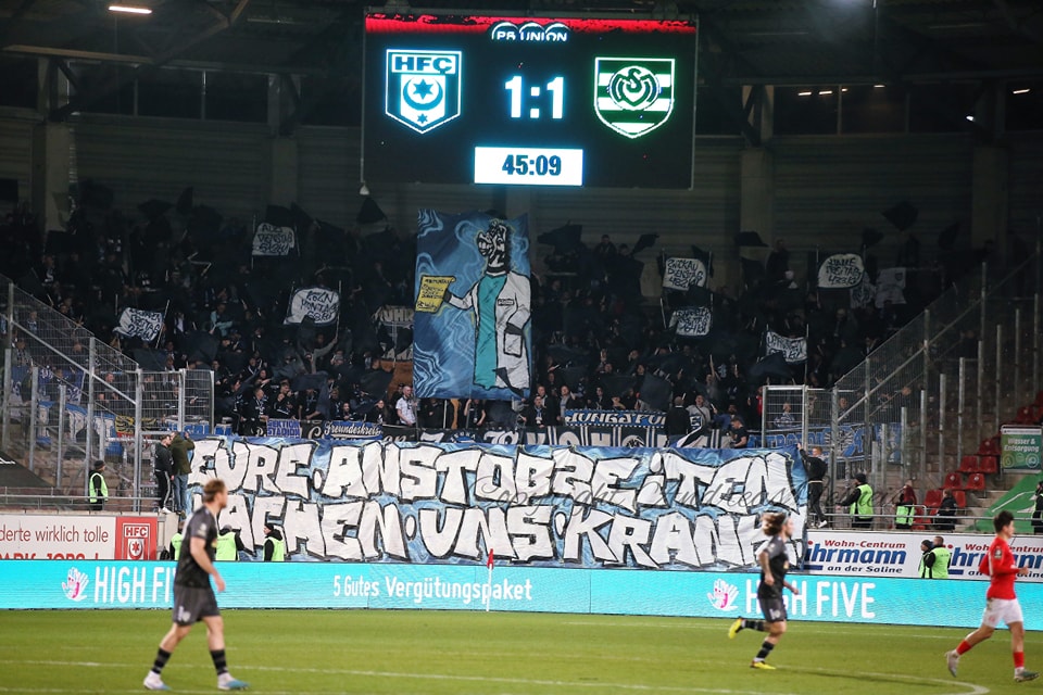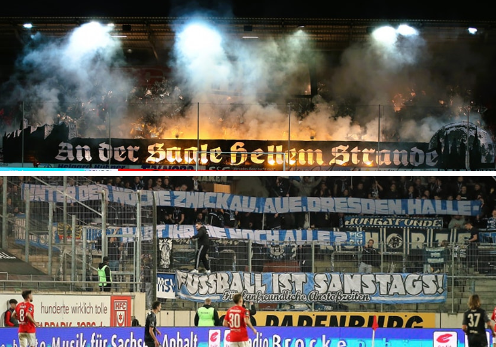 In der HFC-Fankurve wurde das Freitagabend-Spiel der 3. Liga mit einer Choreografie eingeleitet, die mit Pyrotechnik untermalt wurde. „An der Saale hellem Strande“, lautete das Motto der Aktion in Anlehnung an ein gleichnamiges Volkslied.