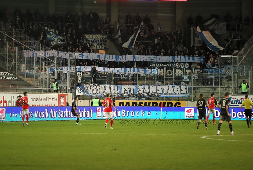Die mitgereisten MSV Duisburg-Fans protestierten gegen fanunfreundliche Anstoßzeit am Freitagabend. Nachdem die Zebras bereits drei Mal zu fanunfreundlichen Zeiten im Osten antreten mussten, folgte nun das Auswärtsspiel in Halle. „Eure Anstoßzeiten machen uns krank“ und „Unter der Woche Zwickau, Aue, Dresden, Halle – Habt ihr sie noch alle?“ war deshalb im Gästeblock zu lesen. Zudem wurde dort die „Fußball ist samstags!“-Fahne gezeigt. (Faszination Fankurve, 25.03.2023)