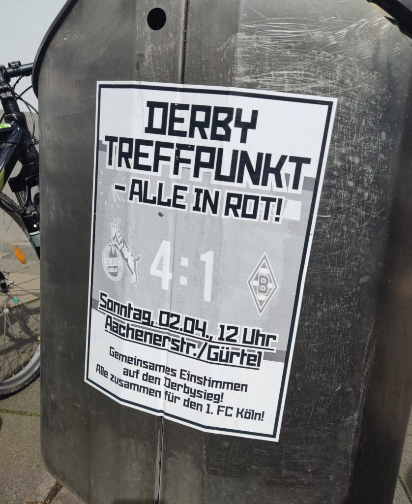 Nachdem die Fanszene des 1. FC Köln bereits einen Treffpunkt für das anstehende Derby gegen Borussia Mönchengladbach sowie den Dresscode „Alle in Rot“ bekannt gab, veröffentlichten heute auch die Mönchengladbacher Ultras das Kleidermotto der Gästefans.