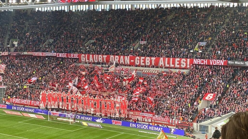 Die Fortuna-Fans leiteten das gestrige Zweitligaspiel, das 2:2 endete, mit einer optischen Aktion an, die unter dem Motto „GLAUBT DRAN – GEBT ALLES“ stand. (Faszination Fankurve, 01.04.2023)