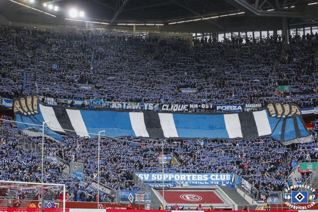 Im Oberrang des Gästeblock organisierten die HSV-Ultras hinter einer erweiterten „Nordtribüne Hamburger Sport-Verein“-Zaunfahne den Support. Außerdem wurden in der ersten Reihe des Oberrangs im Gästeblock zahlreiche rote Bengalische Fackeln von HSV-Ultras abgebrannt.