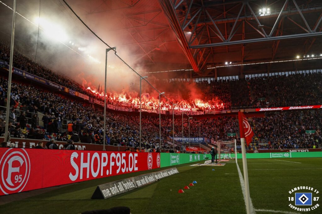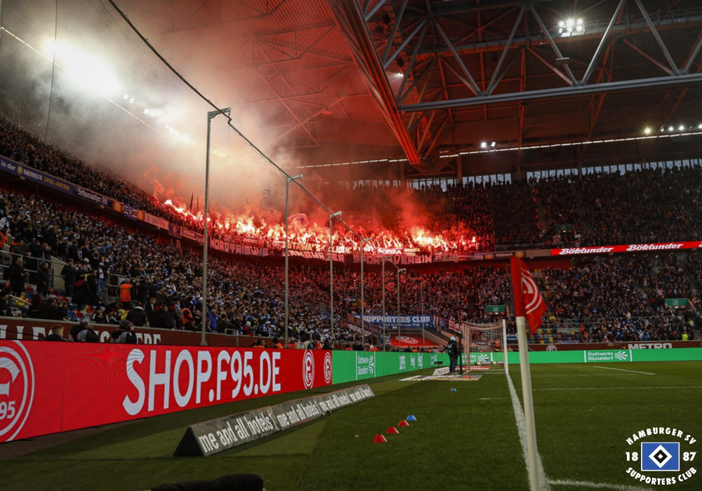 Im mit 52.200 Fans ausverkauften Rheinstadion traten die etwa 20.000 HSV-Fans am Freitagabend einheitlich mit Balkenschals auf. Als Intro präsentierten die HSV-Fans einen riesigen Balkenschal im Gästeblock und hielten dahinter ihre Balkenschals hoch. Der HSV Supporters Club hatte dazu aufgerufen. Die Mannschaft lief zudem mit Sondertrikots zum Jubiläum des Supporters Clubs auf. Nordtribüne Hamburg und HSV Supporters Club organisierten eine gemeinsame Anreise zahlreicher HSV-Fans mit Bussen vom Volksparkstadion nach Düsseldorf. Diese Sternfahrt fand ebenfalls zum 30. Geburtstag der Supporters statt.