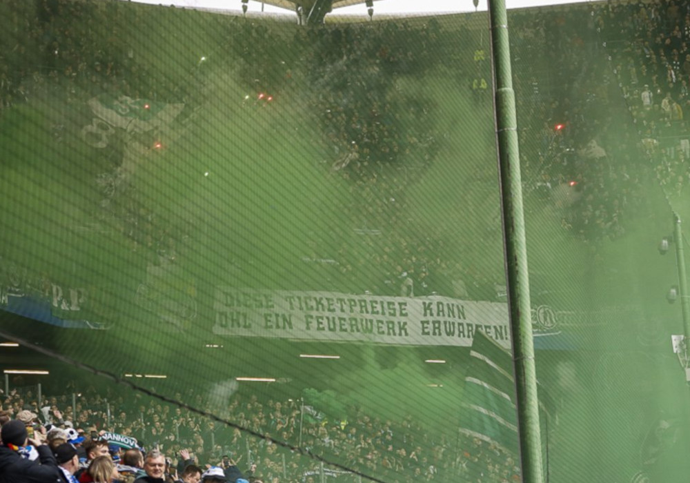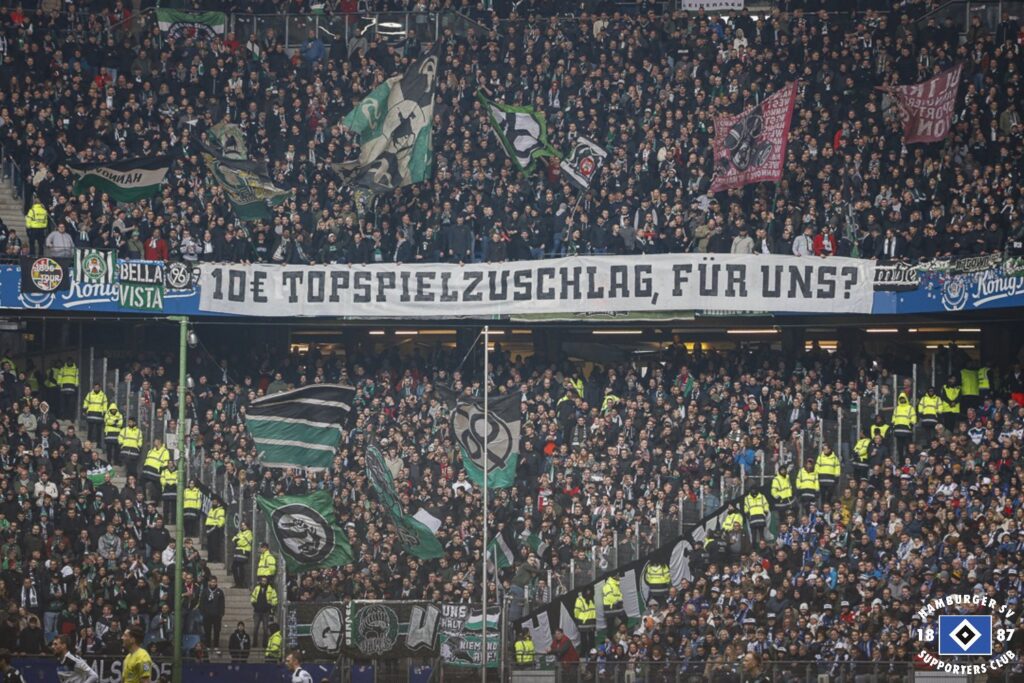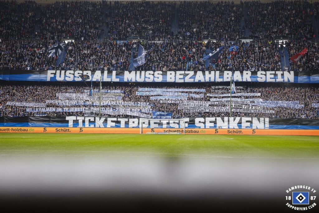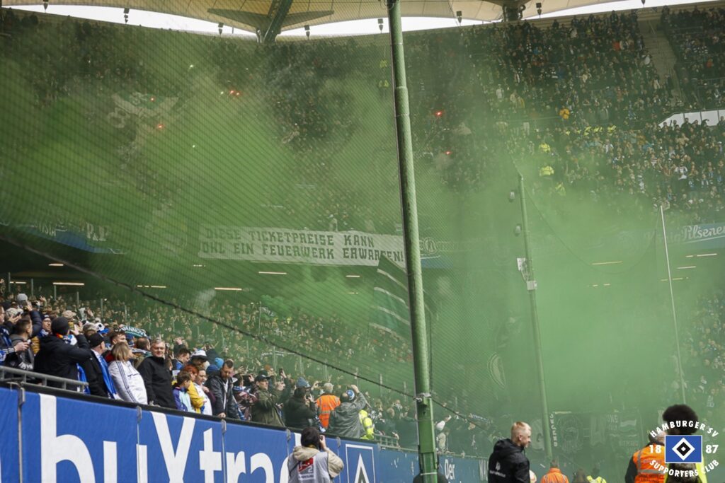 Die Fans des Hamburger SV protestierten beim heutigen Heimspiel gegen Hannover 96 gegen hohe Ticketpreise beim HSV. Auch die Gästefans aus Hannover unterstützten den Protest und leiteten eine Pyroshow mit einem „Für diese Ticketpreise kann man wohl ein Feuerwerk erwarten!“-Plakat ein.
