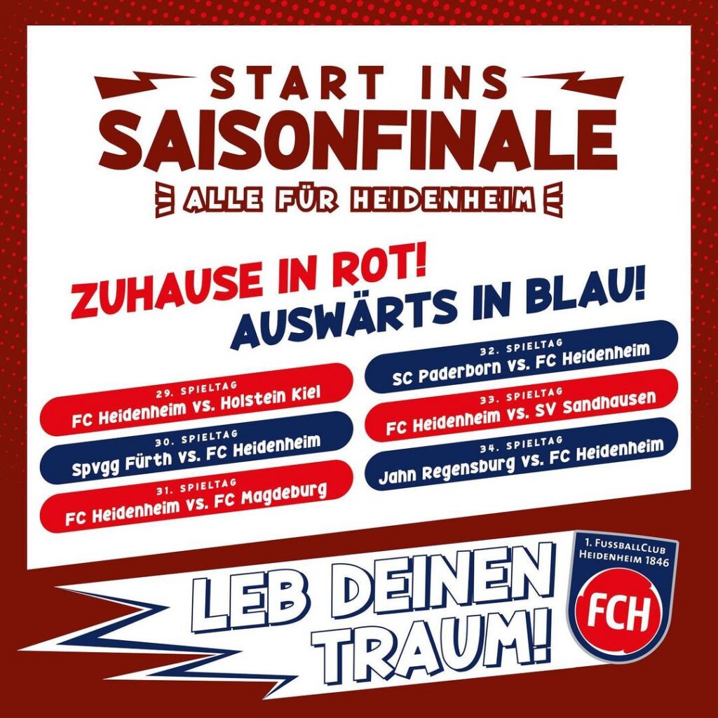 Die Heidenheimer Fanszene will hingegen bei allen restlichen Heimspielen geschlossen in Rot und bei Auswärtsspielen geschlossen in Blau auftreten. „Leb deinen Traum“, so der Aufruf der Heidenheim-Fans zum Aufstiegskampf. (Faszination Fankurve, 21.04.2023)