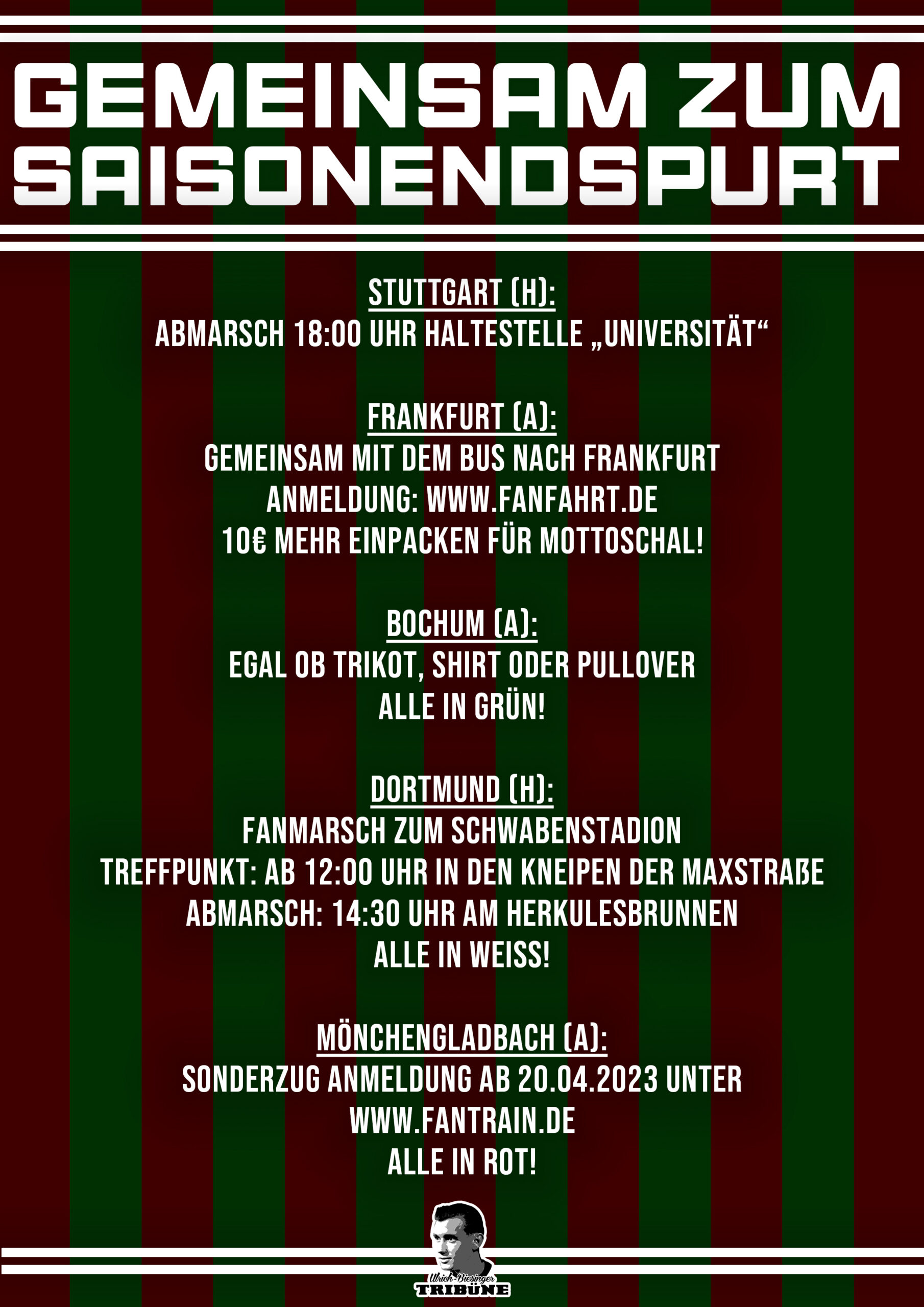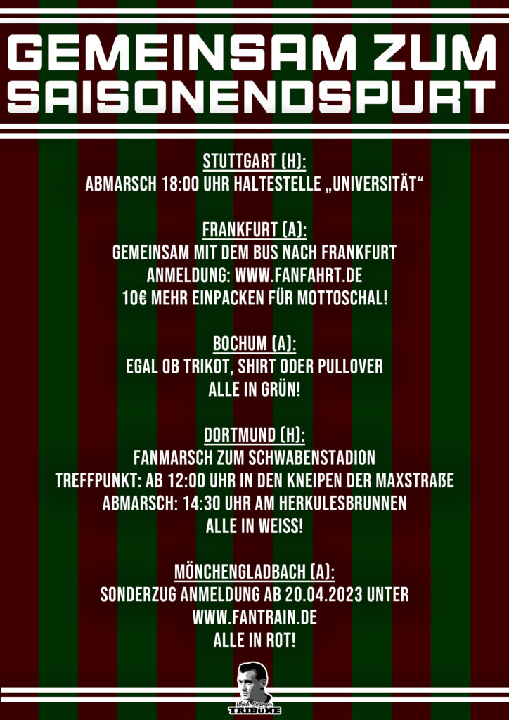 Die FCA-Fanszene will zum heutigen Heimspiel gegen Stuttgart ab 18:00 Uhr von der Haltestelle Universität zum Schwabenstadion laufen. In Frankfurt ist eine Aktion mit Mottoschals geplant und in Bochum will man in Grün auftreten. Gegen den BVB ist ein Fanmarsch vom Herkulesbrunnen geplant und zum Spiel in Mönchengladbach reist die FCA-Fanszene im Sonderzug an. Im Borussia-Park wollen die FCA-Fans in Rot ein einheitliches Bild abgeben.